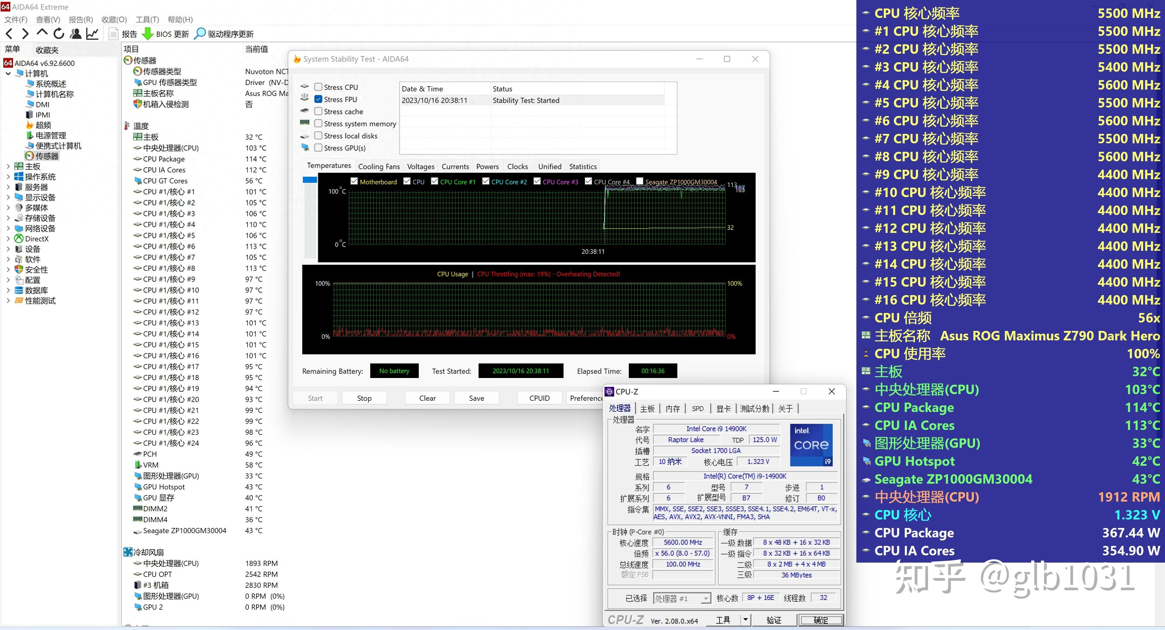 通过测试可以看出新一代桌面酷睿处理器的功耗来到了一个新的高度,上一代i9处理器功耗也达到了300W ,而这次测试的i9 14900K 处理器的功耗更是达到了一个新的高度,最高甚至可达400W 。这样就对散热提出了更高的要求,这里测试选择搭配了华硕 ROG 龙神III 代360mm一体式水冷,可以看到龙神 III 代可以做到在AIDA64 FPU 单烤测试在14900K 烤机功率达到360W 上下,把CPU温度控制在103℃,CPU Package 温度 109℃,14900K 最大睿频5.5GHz。