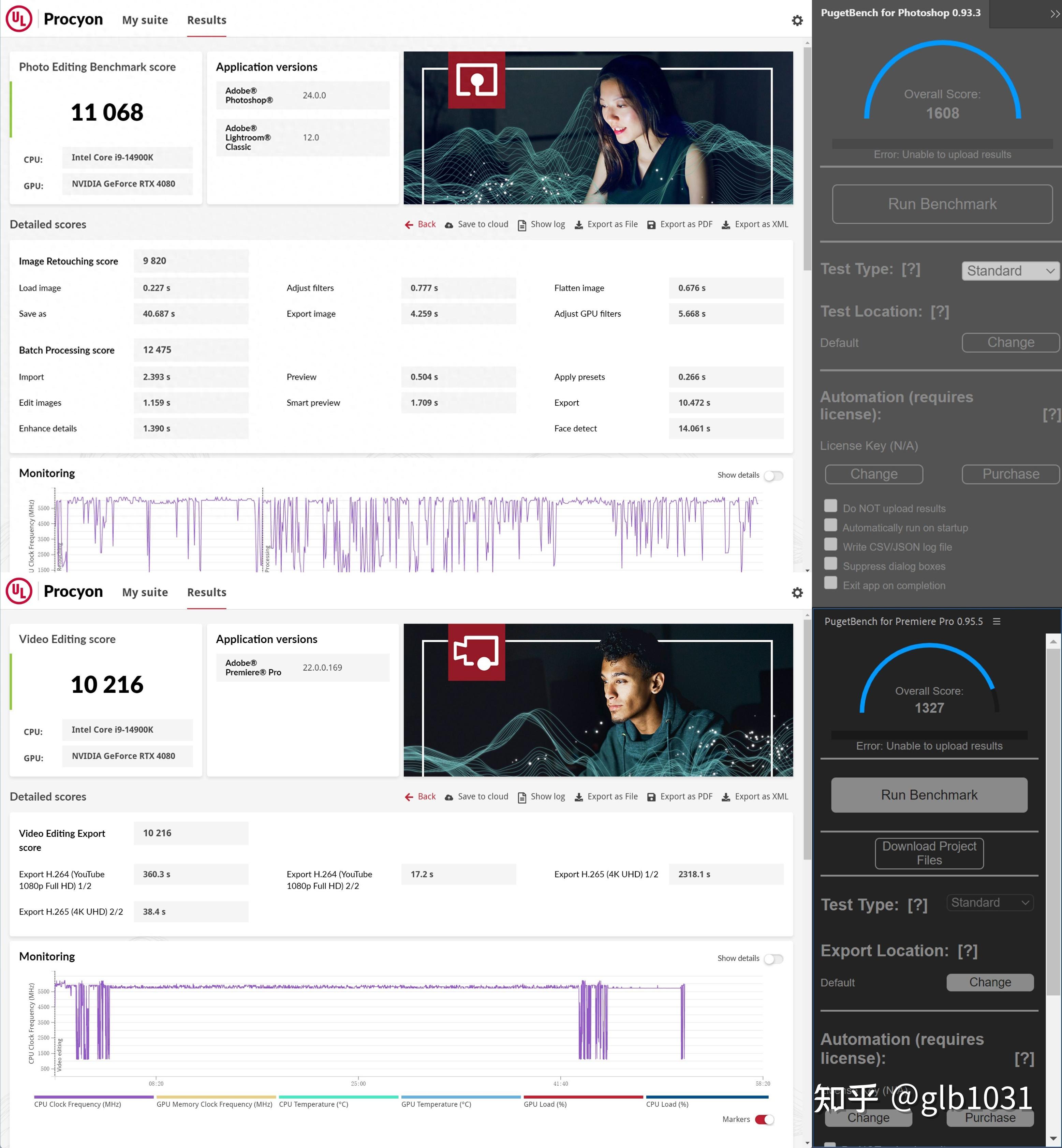 Procyon 软件Pr 视频编辑导出分数 10216;PugeBench 视频处理方面 PugeBench Pr 测试得分1327。