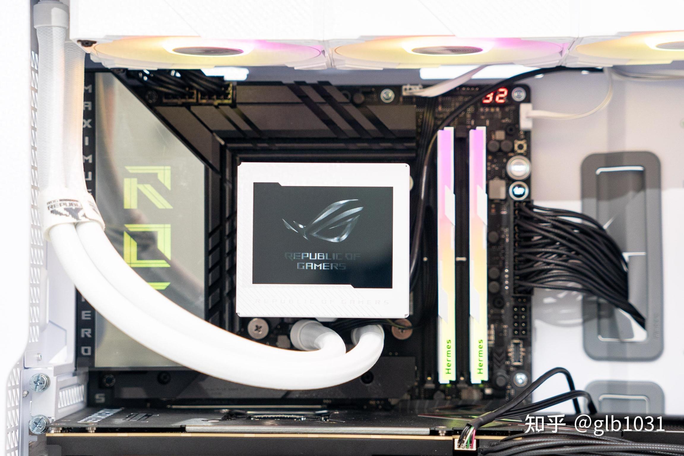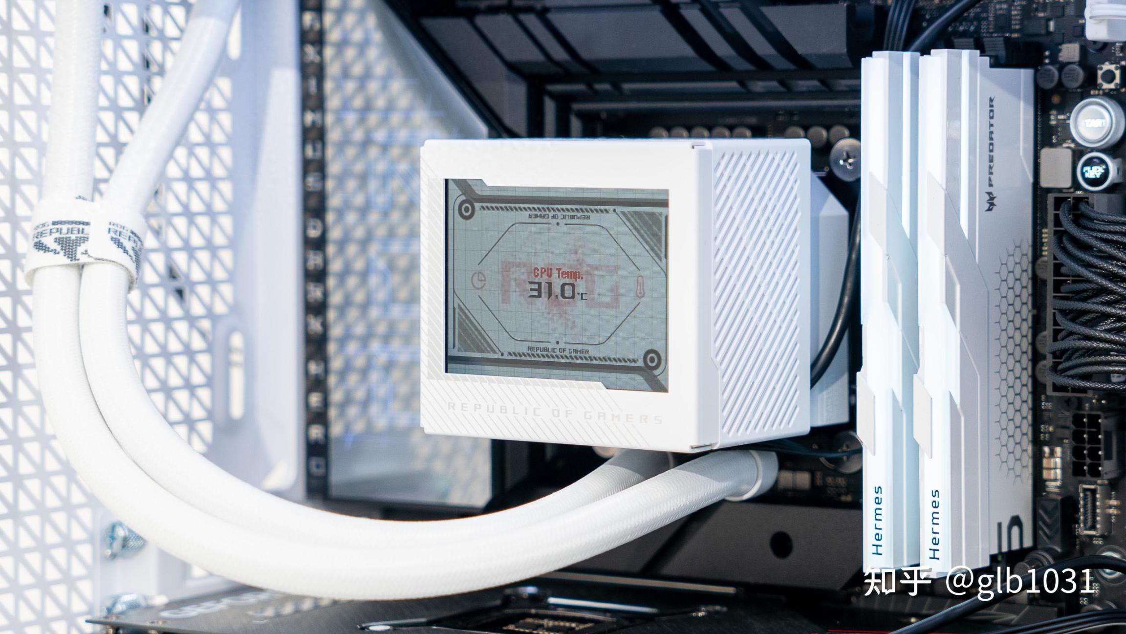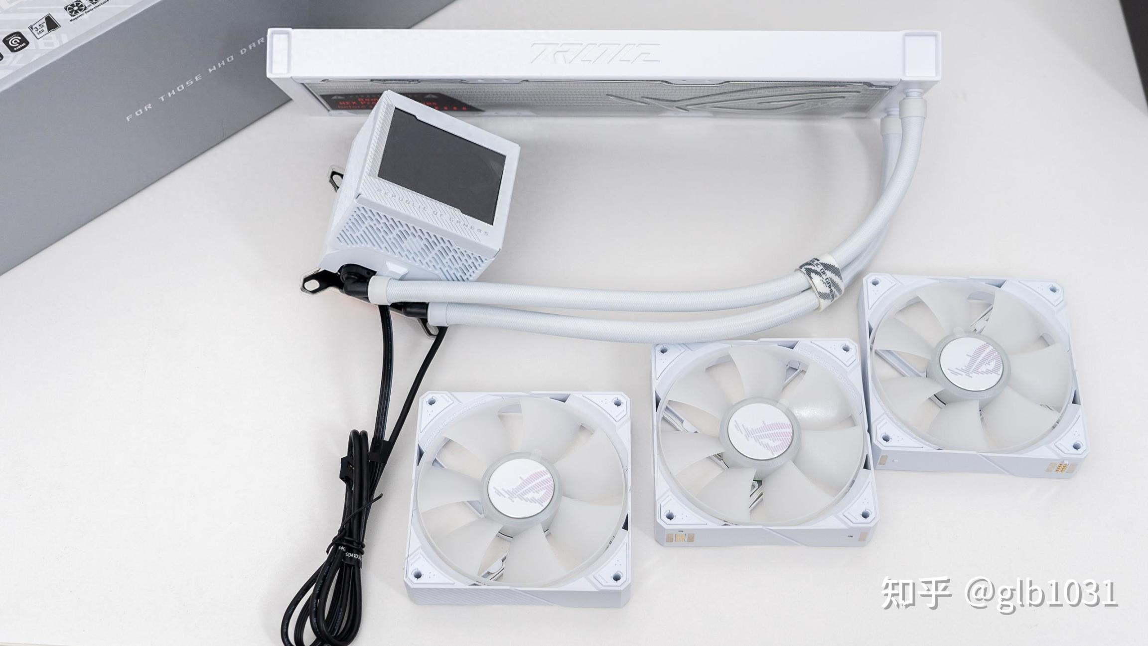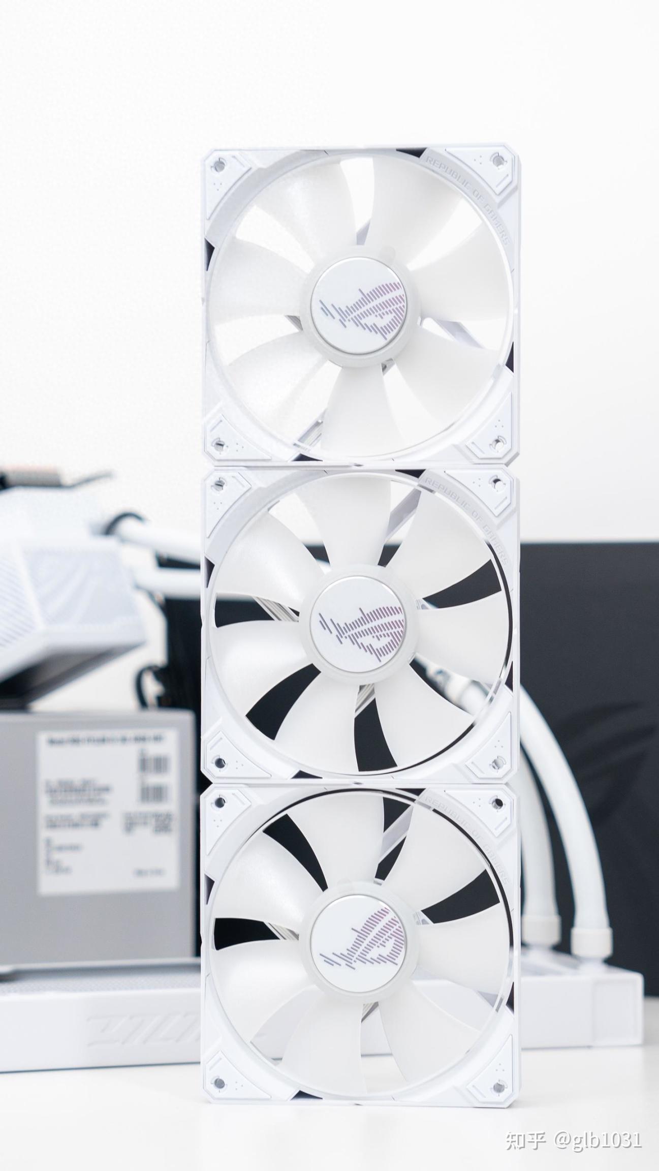 散热方面为了保证散热效果,测试的散热器为华硕 ROG 顶级的龙神 III 白色版本,这也是华硕ROG 系列旗下定位最高的一体式水冷散热器了,采用Asetek 八代水泵设计,黑色版本还有提供猫头鹰风扇的定制版本可选。而白色的版本则是搭配了磁吸设计的ARGB 风扇版本。白色版本就连包装都不同于华硕经典的黑红设计,全白的包装看上去有些小清新的感觉。