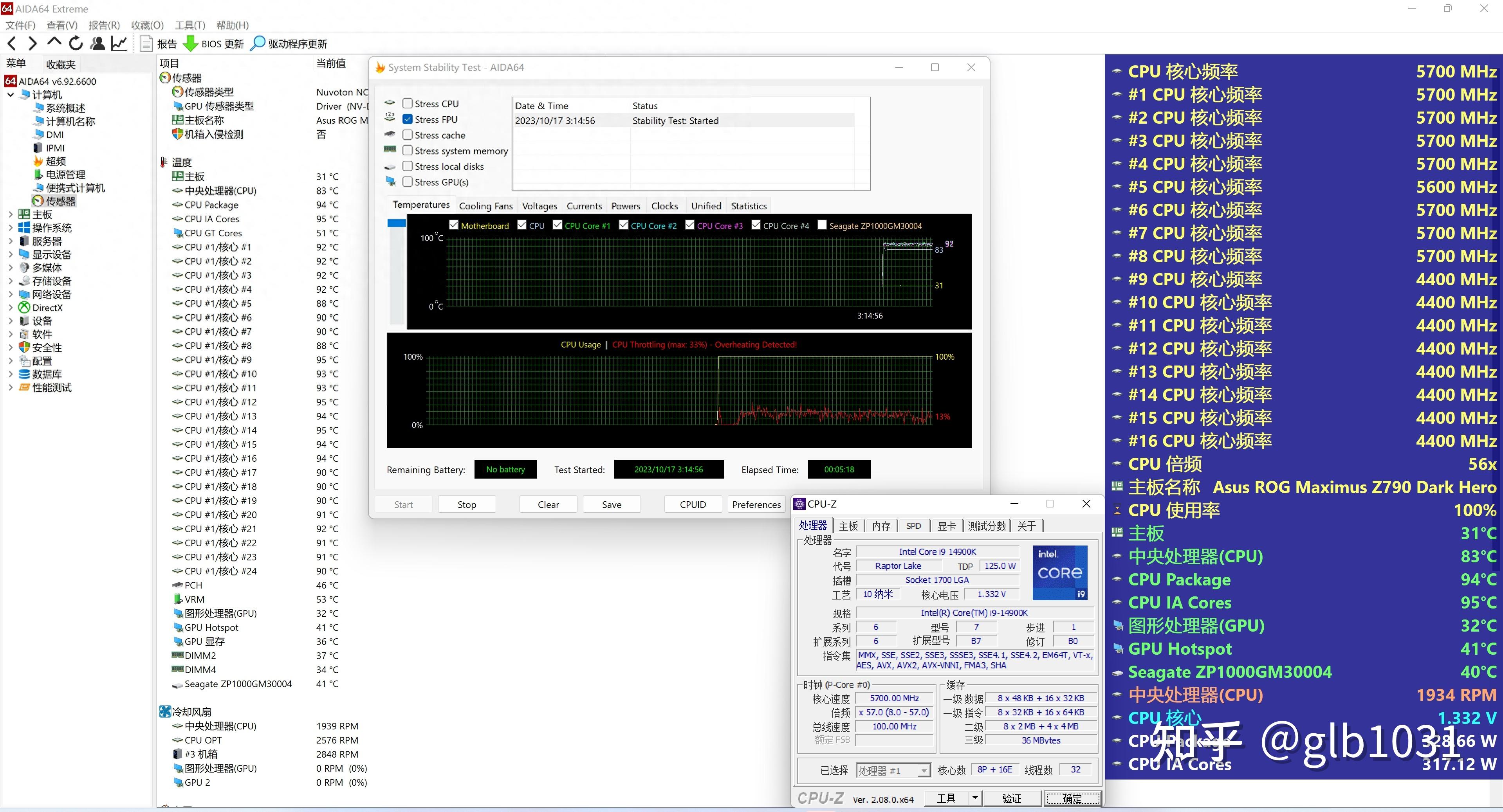 稍作设置华硕 ROG 龙神III 代可以把14900K 的CPU 温度就被控制在83℃,CPU Package 温度 94℃,14900K 最大睿频5.7 GHz,功耗控制在330W 上下。这样可以看到龙神 III 代的性能还是不错的。另外也发现14900K 日常在330W 功耗下基本可以让其实现全性能核5.7GHz。