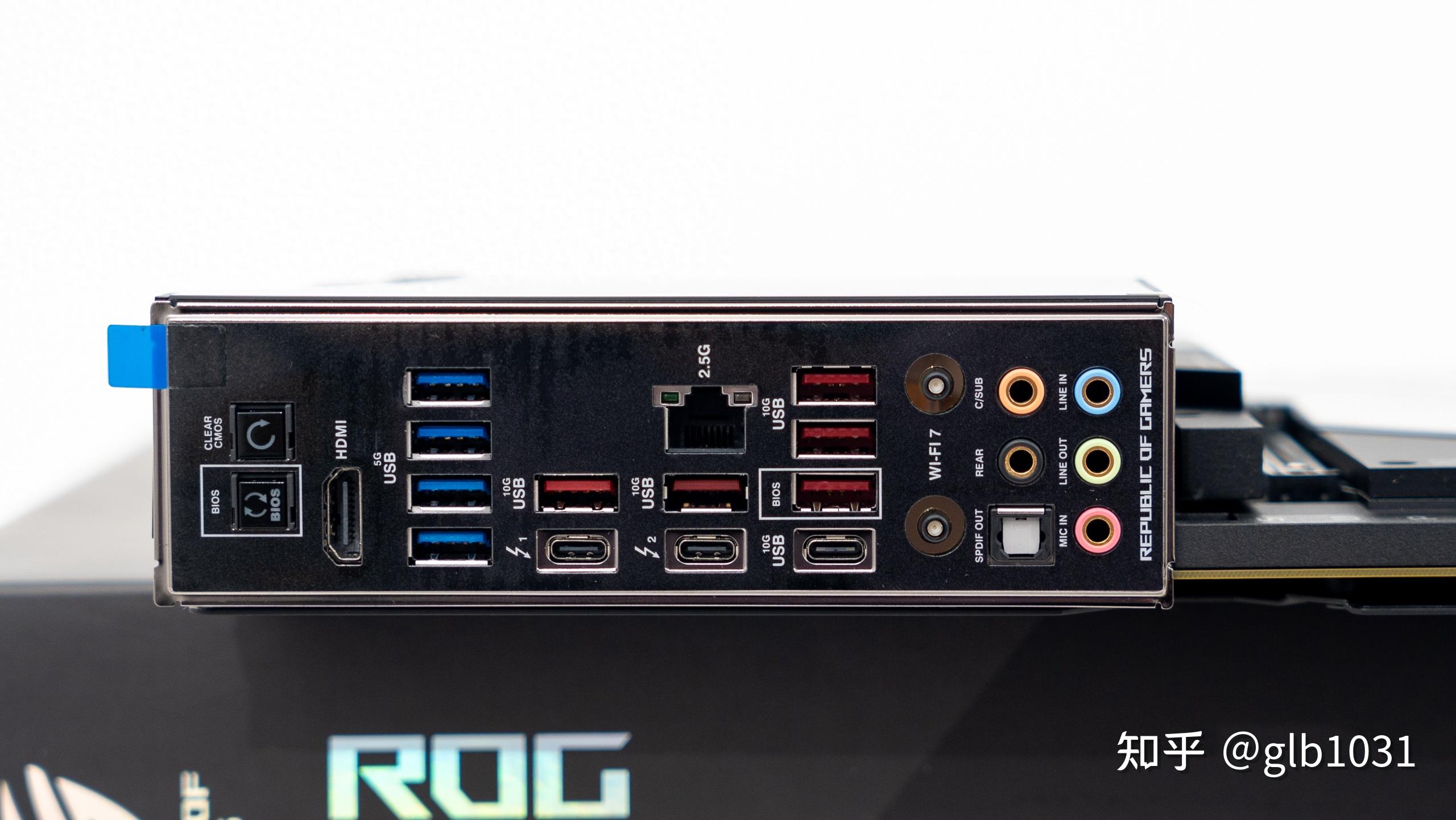 一体式I/O 接口设计必须是标配,从上至下一次可以看到BIOS FLASHBACK 按键、CMOS 按键、HDMI 2.1接口、四个蓝色USB 3.2 Gen1 5Gbps 接口、两个雷电4 Type-C 接口(40Gbps)、五个红色的USB 3.2 Gen2 10Gbps USB-A 接口、2.5G 有线网口、全新的Wi-Fi 7 易拆卸天线接口、光纤以及音频接口。