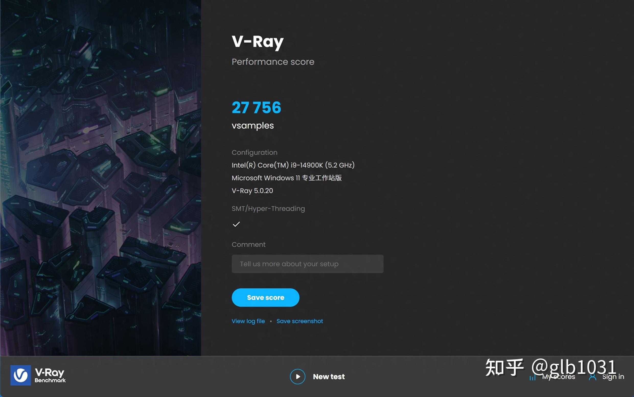 另外也做了V-Ray软件的处理器性能测试,可以看到i9 14900K 得分27756,相比前代旗舰也有5%左右的提升。