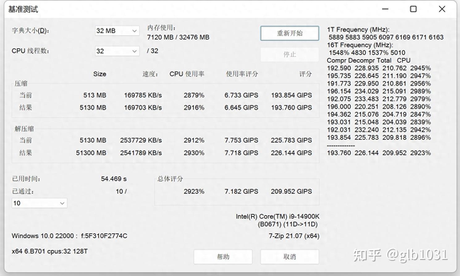 7 Zip 压缩得分 193.760 GIPS,解压缩 226.144 GIPS,总分 209.952 GIPS 。