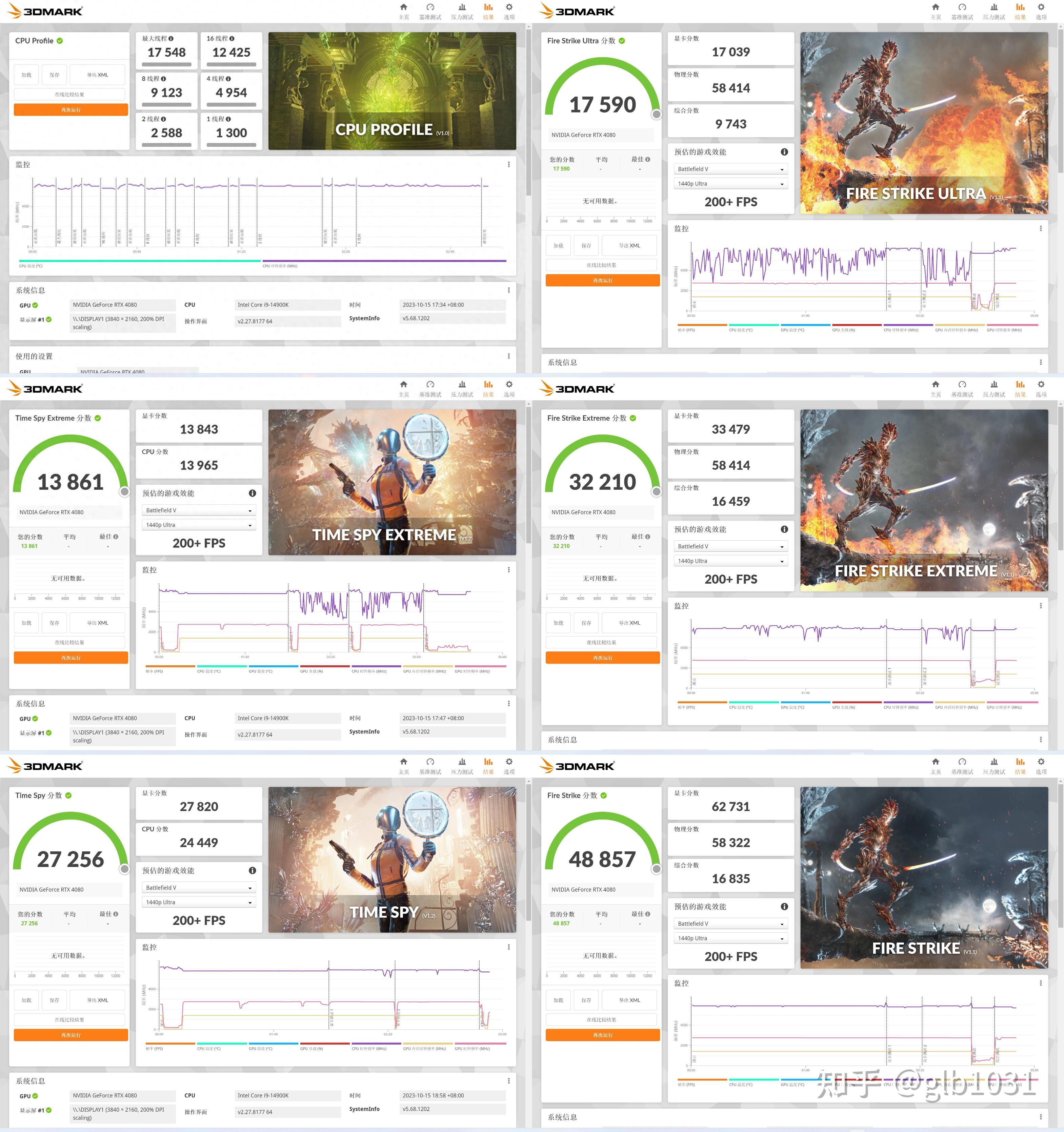 intel i9 14900K的3D Mark测试CPU Profile最大线程分数17548 ;Profile1线程分数1300,Time Spy CPU得分24449,Time Spy Extreme CPU得分13965,Fire Strike 物理分数 58322 。