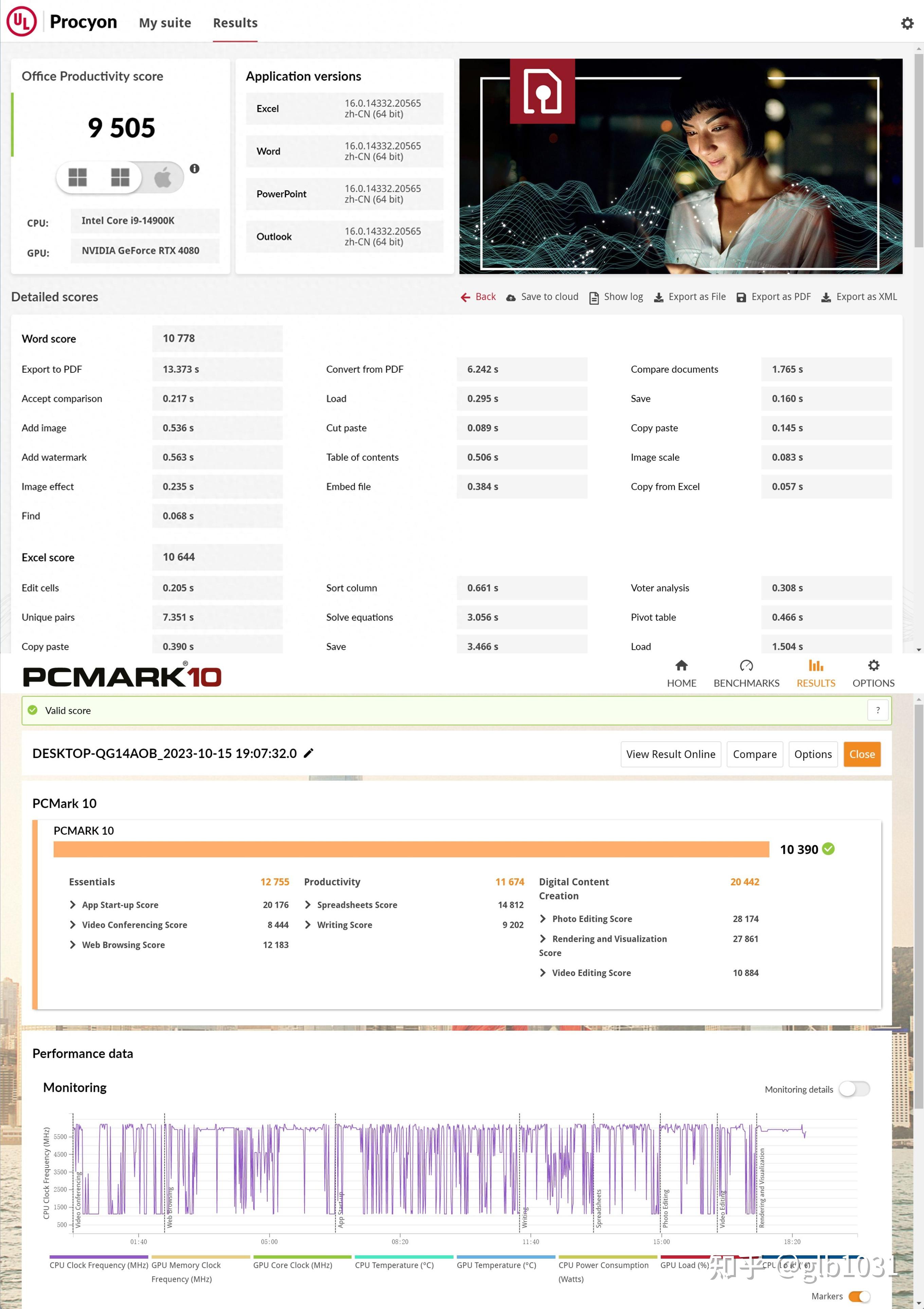 i9 14900K的 PCMARK10测试成绩为10390,其中常规基本功能12755,生产力11674,数位内容创作20442。