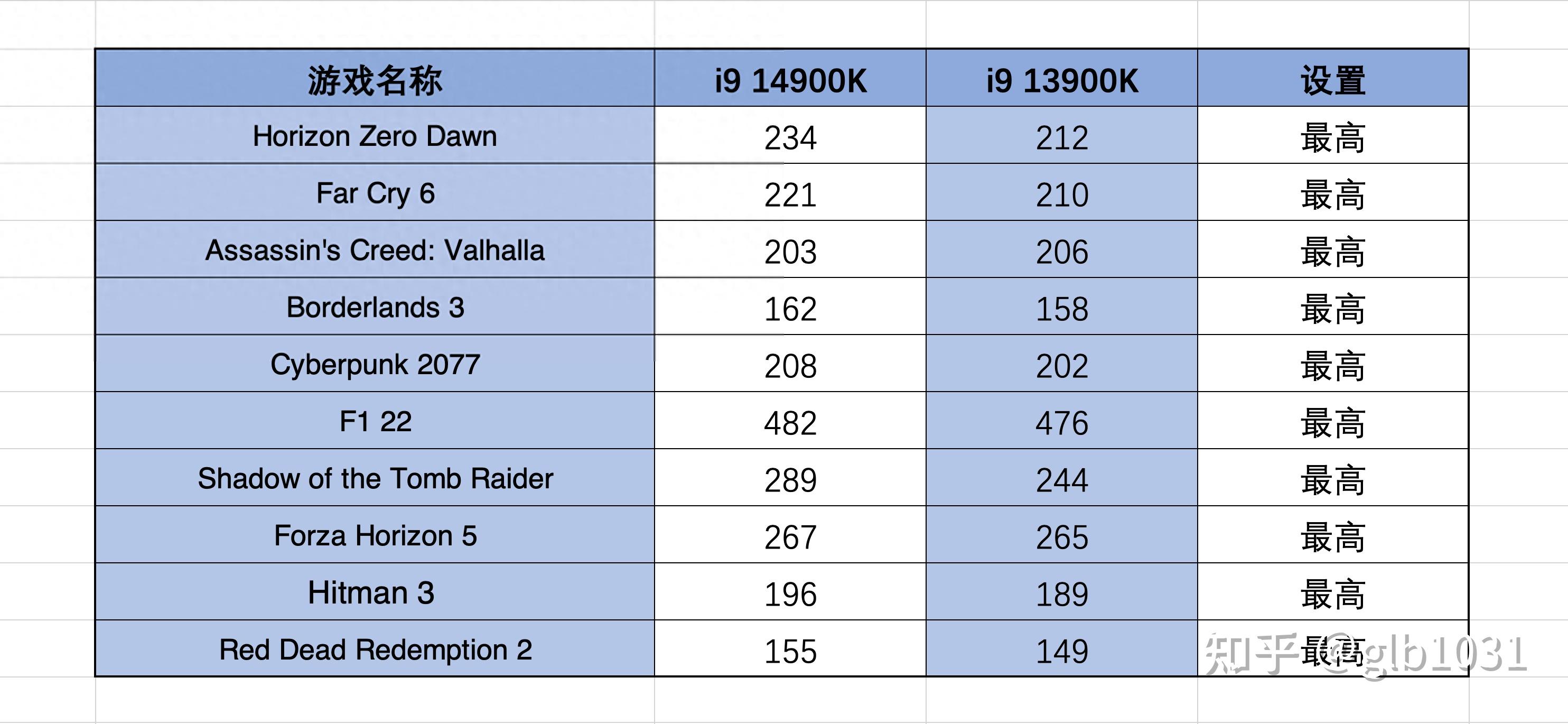 经常看测评的应该明白为什么我都已经用RTX 4080 显卡了,却还要做1080P 游戏测试。但是估计一般小白用户可能还不太清楚,这里也和大家解释一下。可以说目前选择40系的4080/4090显卡,日常玩4K 高画质游戏时实现高刷新率都是很EASY的。这个时候显卡性能对于1080P 分辨率下的影响可以说是忽略不计的。而在1080P 分辨率下主要影响游戏帧数的才是处理器性能,所以这里即便测试的是RTX 4080显卡,但是给大家的参考依旧是1080P 分辨率下最高画质的对比数据,支持DLSS 的游戏都开启了DLSS 功能来降低显卡影响。对比了上一代i9 13900K 的游戏平均帧数,大家可以参考一下我的测试数据。整体来讲游戏表现方面14900K 已经不亏是一款旗舰,本事频率的提升自然会有游戏帧数上有所表现。所以整体帧数变化基本也与之前基础性能测试提升数据类似。