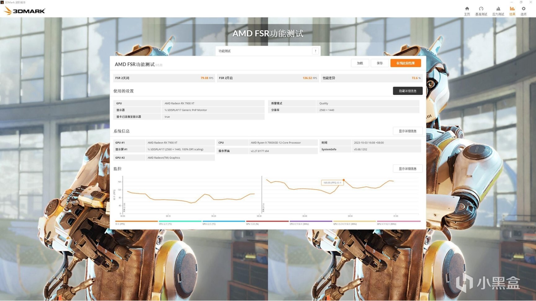 AMD FSR 光追功能测试:关闭状态帧数79FPS,开启后帧数提升到136FPS。
