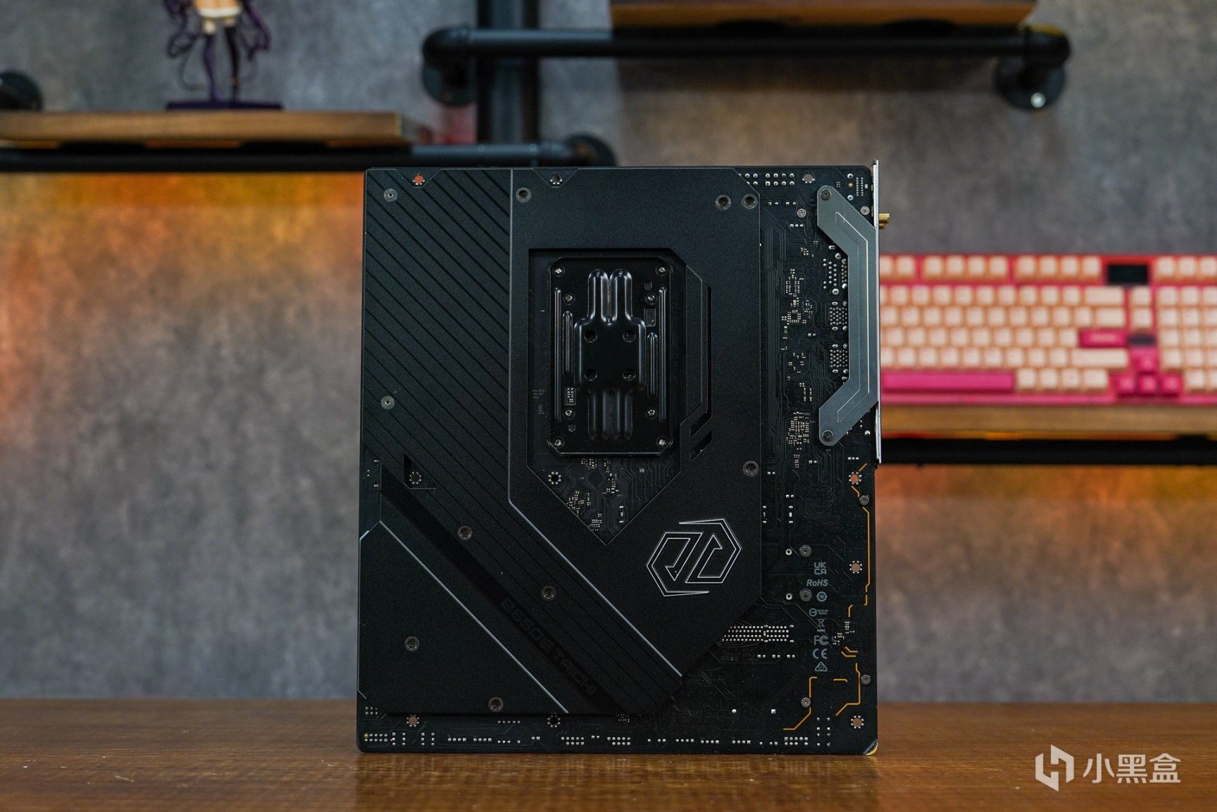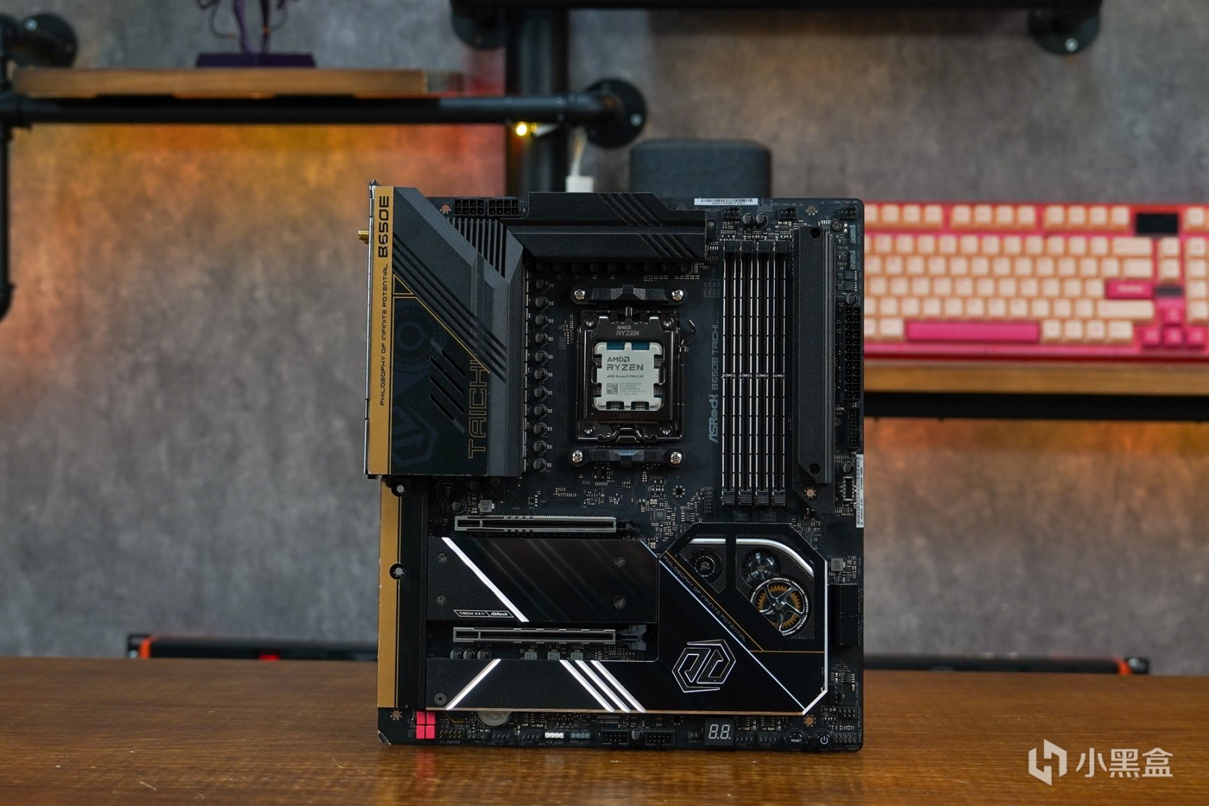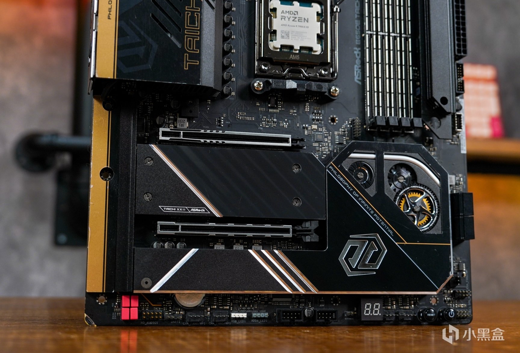 说到主板的外观,金属工业风设计已经是深入到Taichi系列的“血液”里。而B650E的配色设计和X670E的经典黑白配色有着明显的区别,B650E则采用黑金配色的板面配色设计,主板上部供电部分的左侧和上侧和主板背面均覆盖有面积巨大的抛光材质的金属马甲散热件覆盖,芯片组散热饰罩上沿袭了太极齿轮的设计,齿轮设计也是最能体现Taichi主板工业风风格的标志,可以说没有几张主板更能体现这种重金属工业风设计能超越Taichi。所以拿来搭配这次的赛博朋克风格配色的装机也是契合度非常高的。