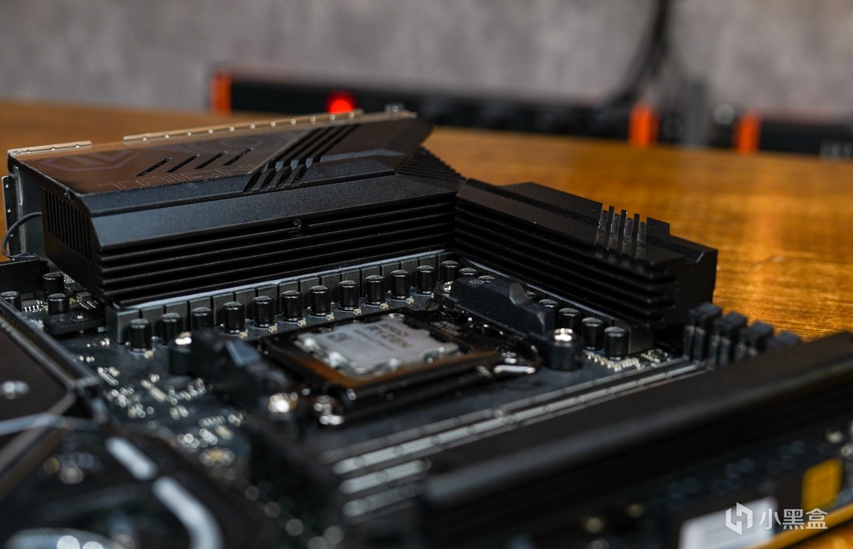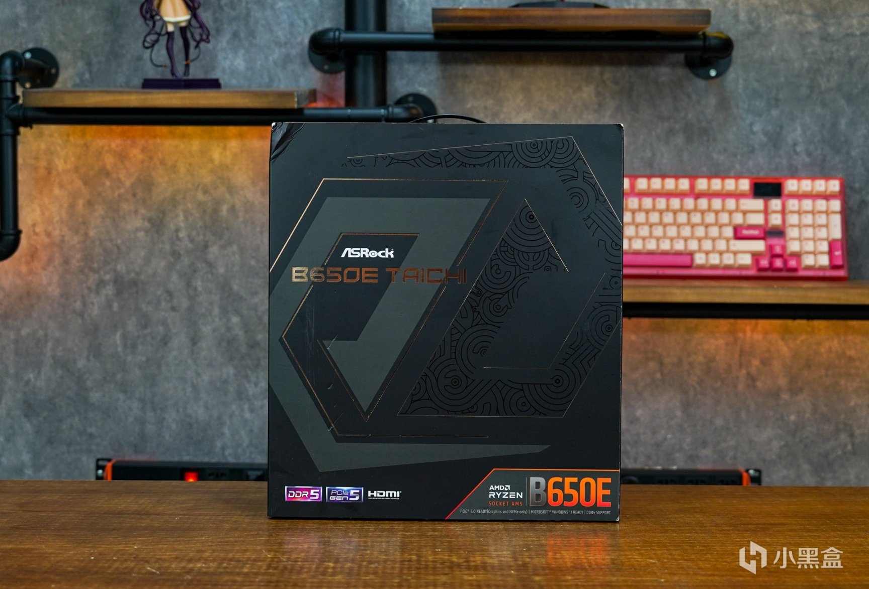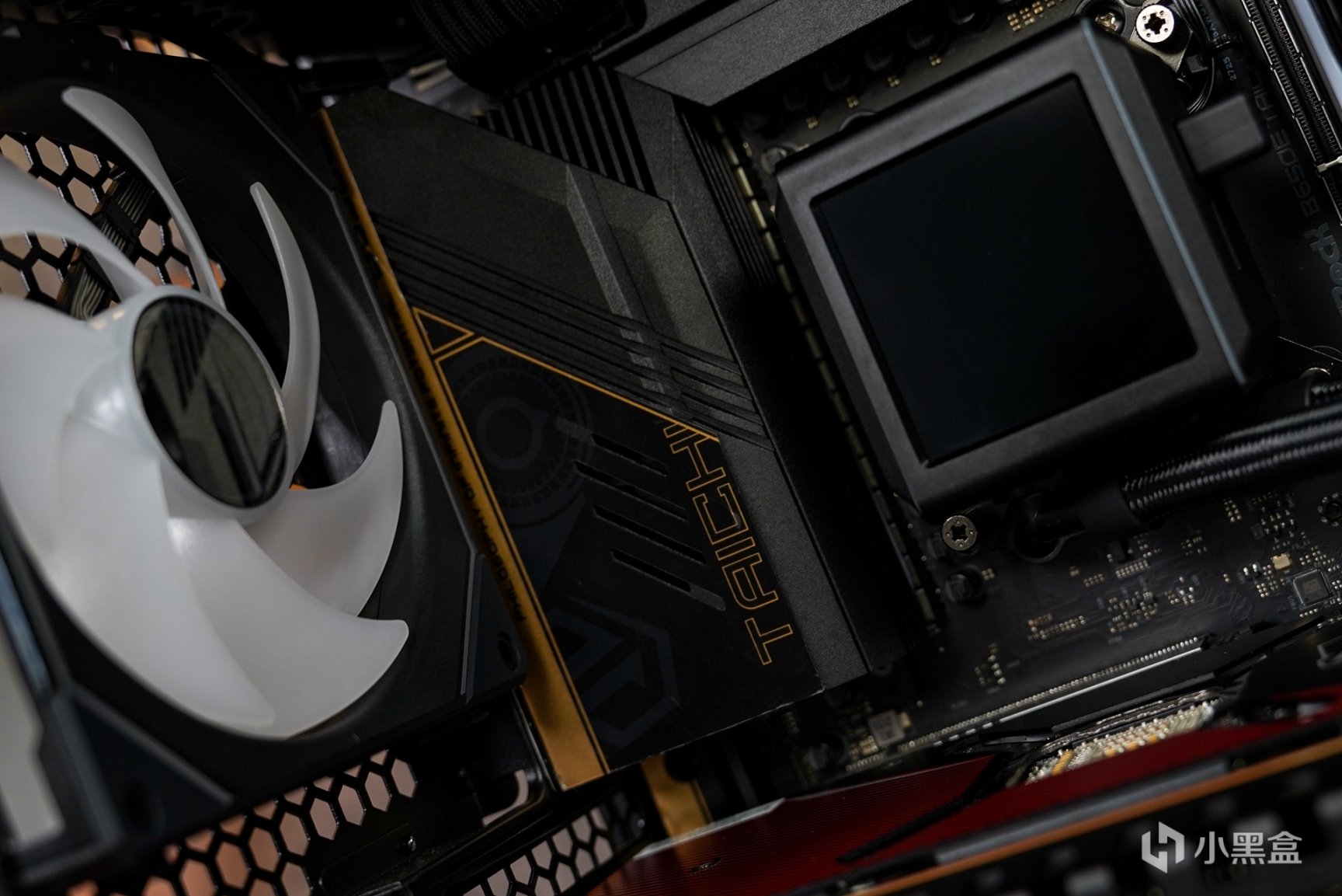说到主板的外观,金属工业风设计已经是深入到Taichi系列的“血液”里。而B650E的配色设计和X670E的经典黑白配色有着明显的区别,B650E则采用黑金配色的板面配色设计,主板上部供电部分的左侧和上侧和主板背面均覆盖有面积巨大的抛光材质的金属马甲散热件覆盖,芯片组散热饰罩上沿袭了太极齿轮的设计,齿轮设计也是最能体现Taichi主板工业风风格的标志,可以说没有几张主板更能体现这种重金属工业风设计能超越Taichi。所以拿来搭配这次的赛博朋克风格配色的装机也是契合度非常高的。