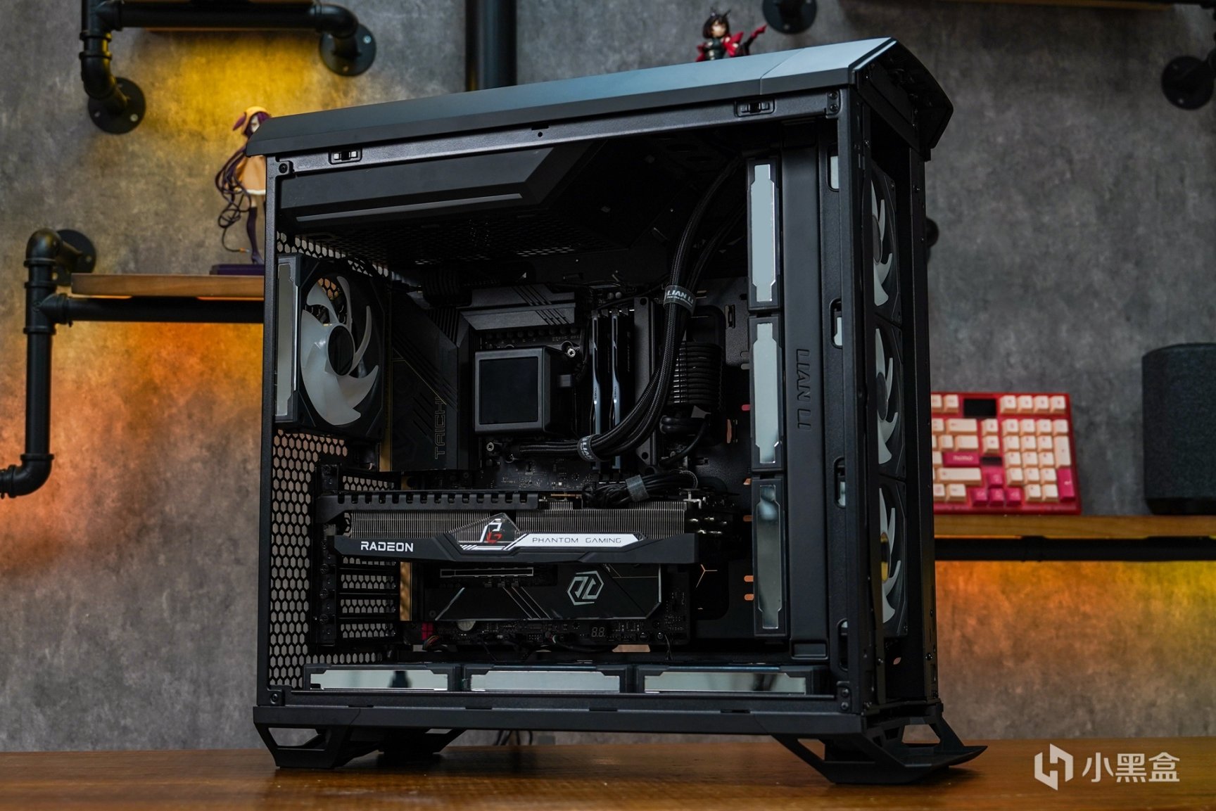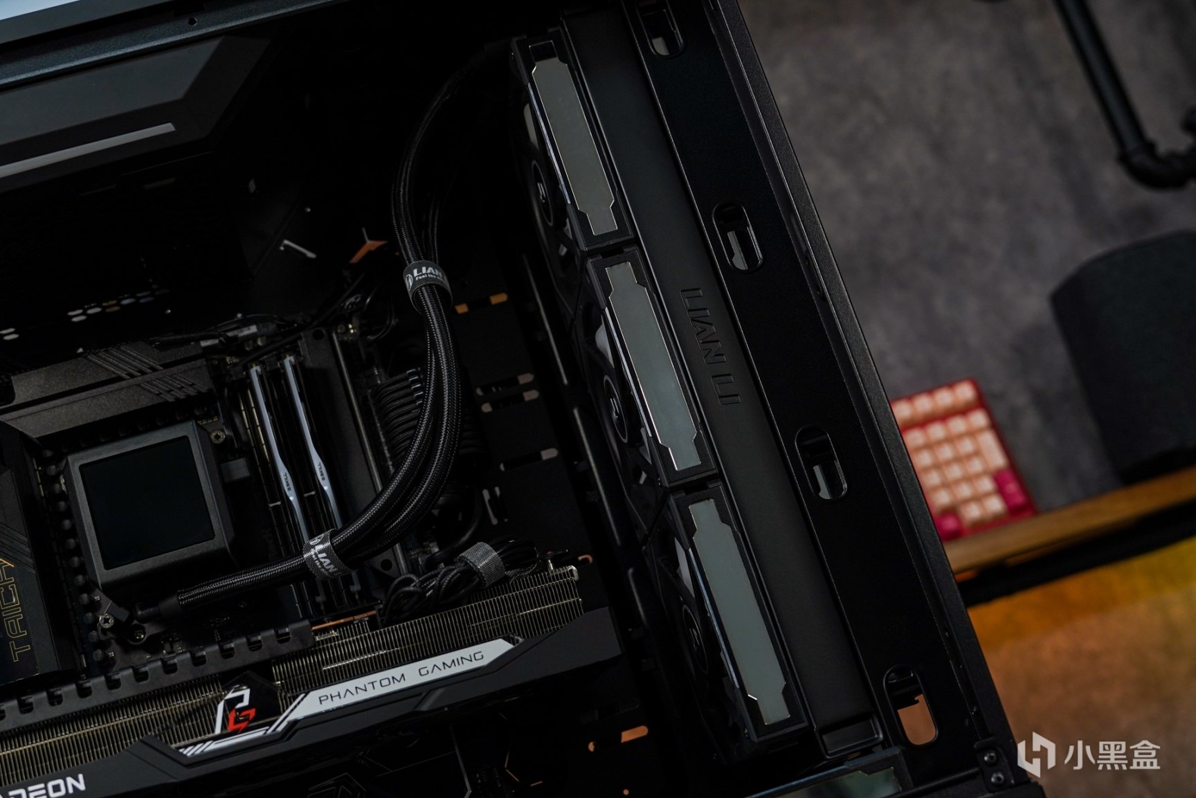 再来看下整机在安装上一些要点,所有配件入箱后,因为箱体的空间是非常充裕的,在安装时基本都不需要考虑所谓的硬件兼容问题。无论你是想安装大型风冷,抑或是大型的420MM尺寸的水冷都可以轻松搞定。