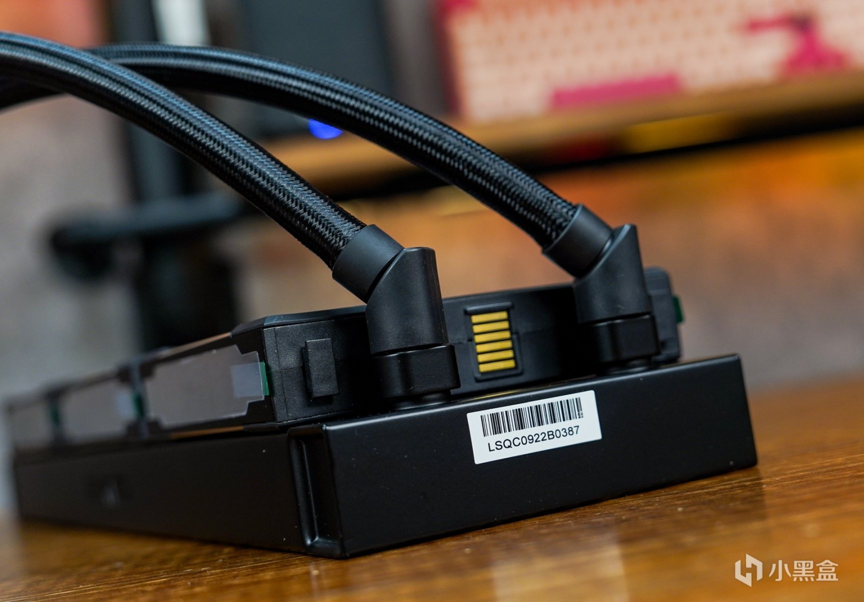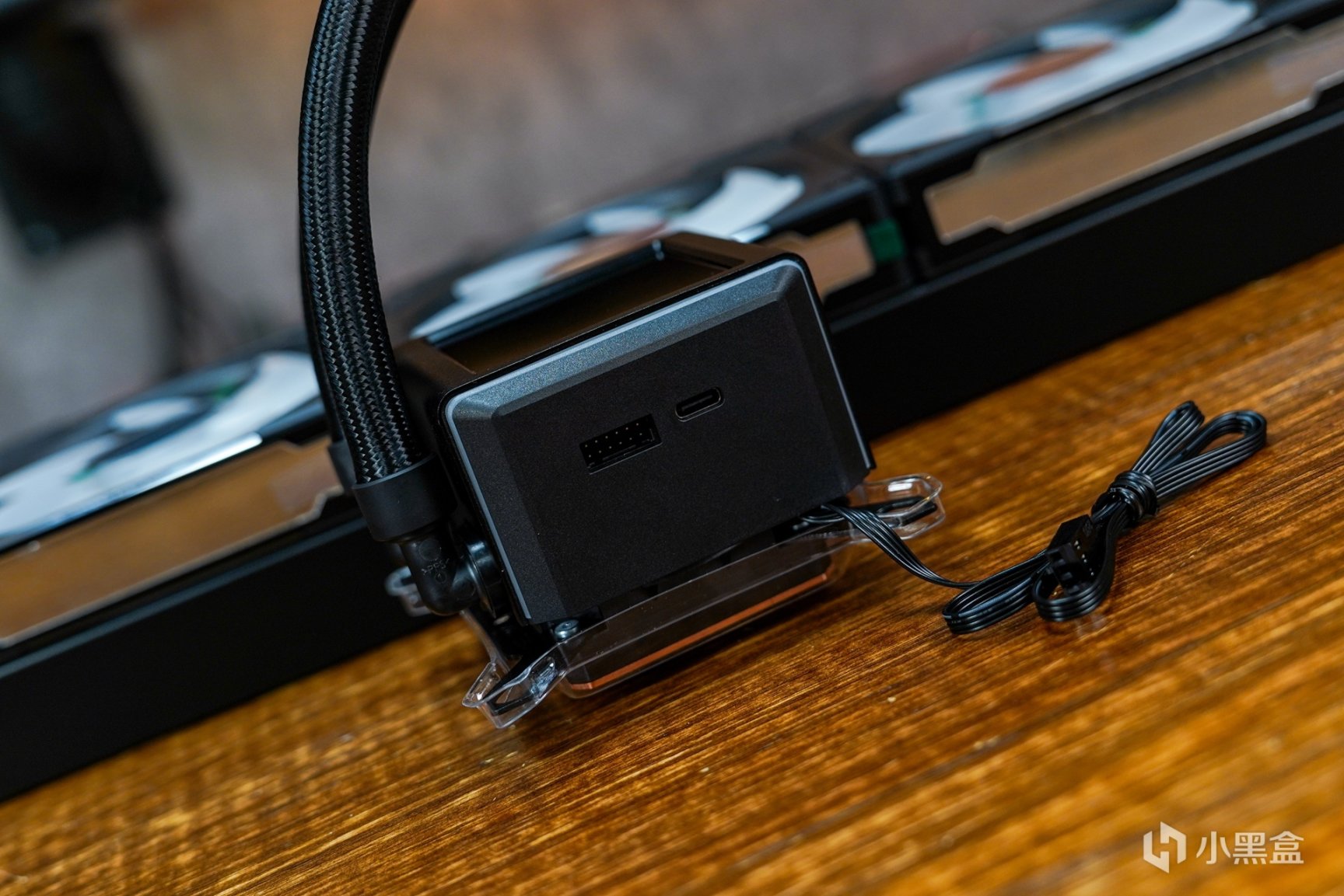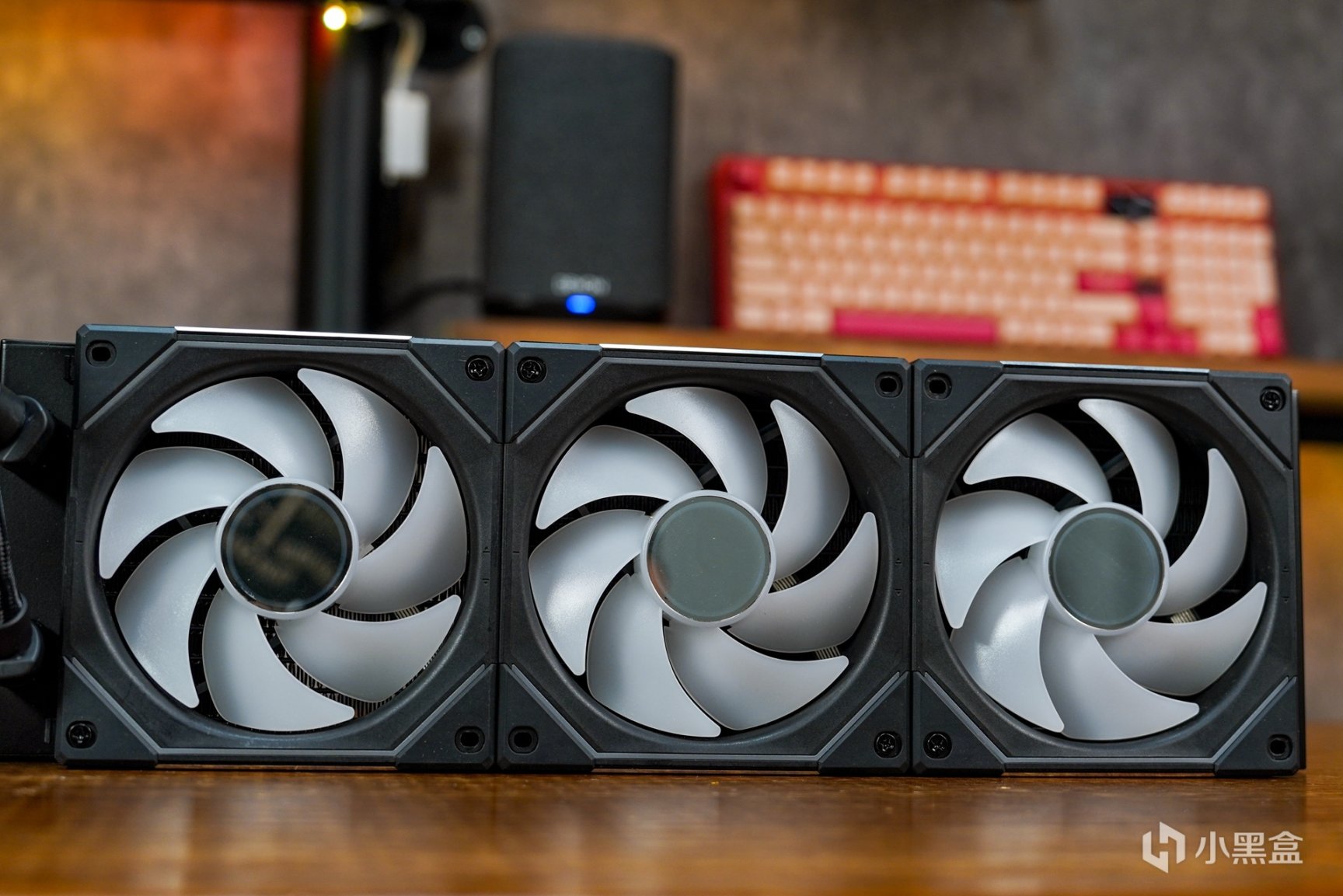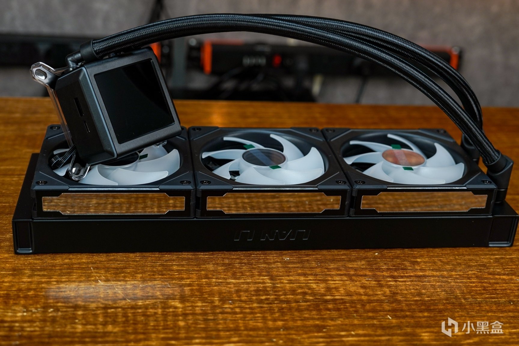 水冷的风扇则是使用3颗120MM的三代幻镜积木风扇,而不同于市面在售的积木3代风扇,水冷自带的三颗是经过加强的积木3代风扇,参数和在售的积木3代风扇会有不同的,风扇速度:200~2450 RPM,风压:3.26 mmH2O,气流:79.9 CFM。风扇的拼接方式和ARGB连接都是和积木三代通用的,可共用风扇控制器或者直连主板,并且可通过 L-Connect 3软件来进行联力的积木风扇、霓彩线、极圈2代水冷进行控制。
