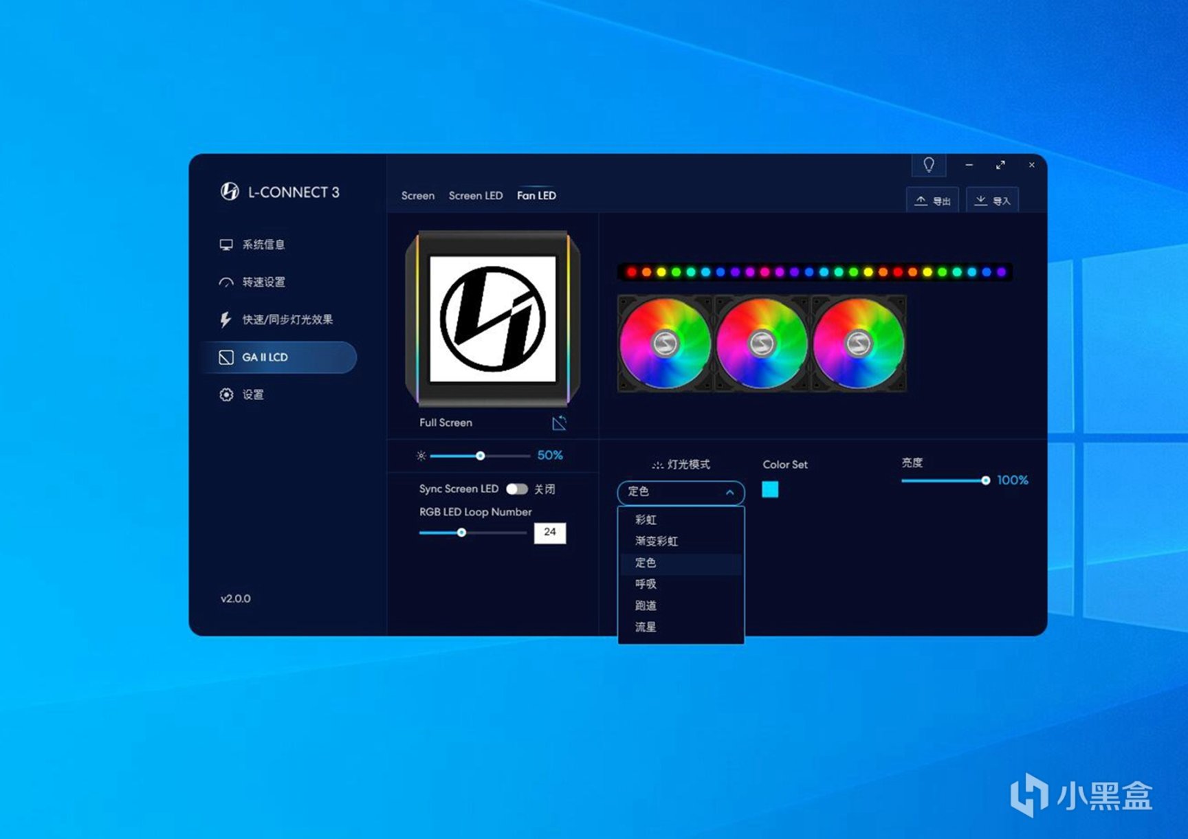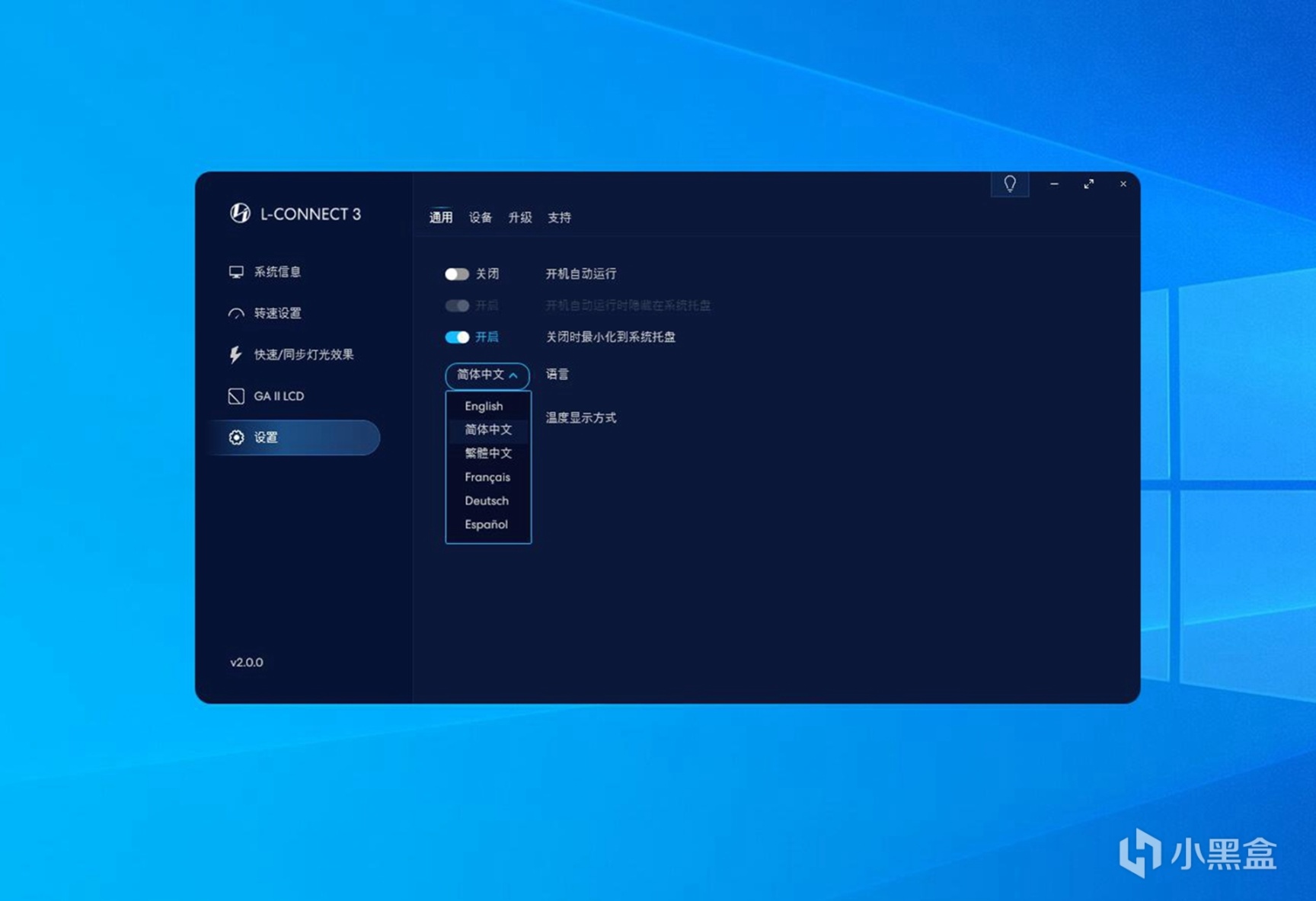 测试部分首先来看下这款联力旗舰360水冷的一些设置要点:开机后,L-Connect 3软件的界面是有所改变的,新增了GA II LCD选项,右边第五个设置选项:有6组默认的语言选项,其中包括简体中文。接着第一和第二选项是系统温度监控和风扇转速选项,可以按照自己的要求来进行机箱风扇调控,要是选择和主板同步的话,风扇转速调控可以直接在主板自带软件上进行设置。