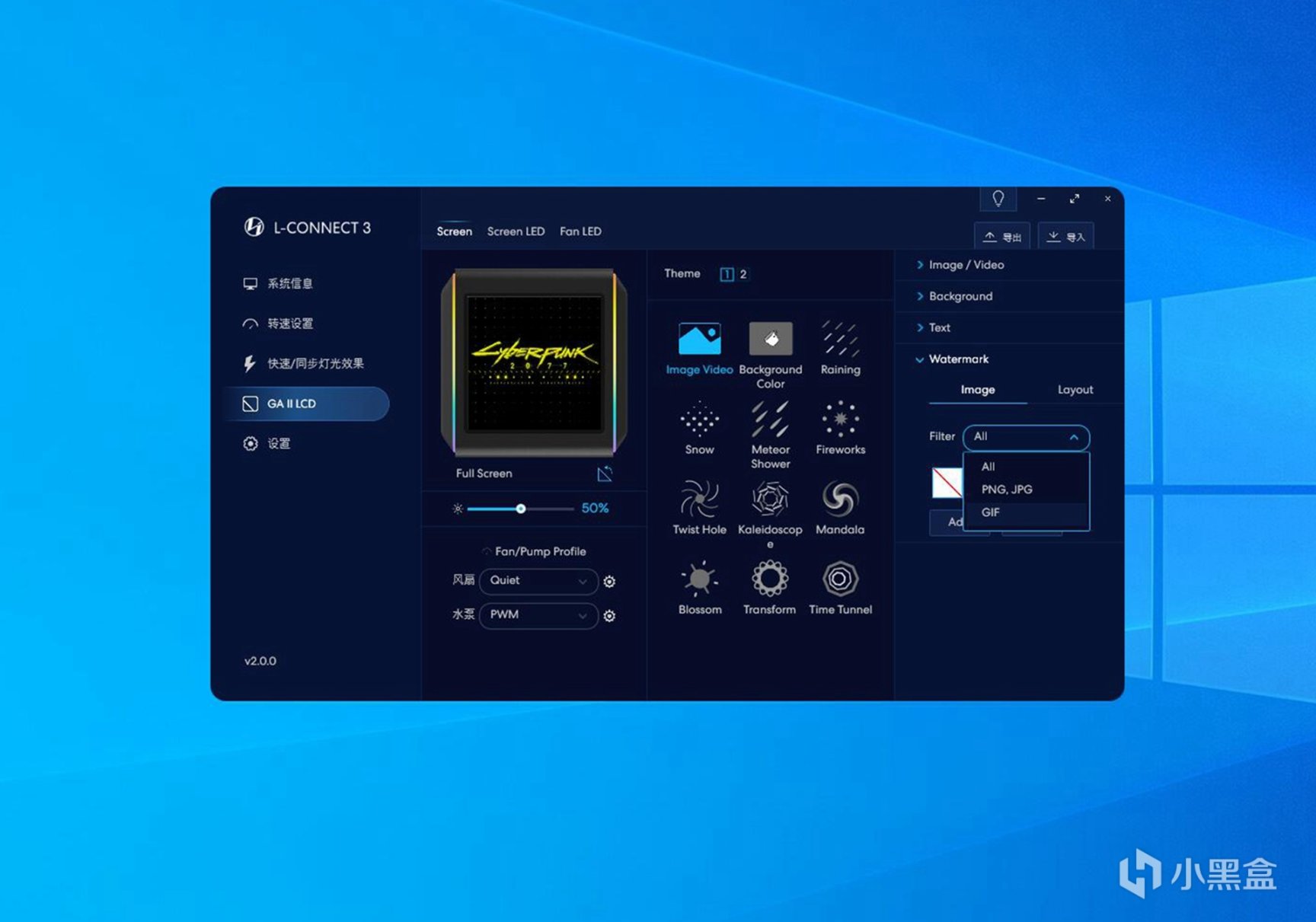 第四项GA II LCD是可选择预设和上传文件的LCD屏幕的选项栏:默认图案是动态的GIF联力LOGO开机画面,默认灯效流光模式。可以通过右侧的选择栏里进行调控可用于显示不同的系统信息,像是CPU温度、CPU系统负载、GPU温度、GPU系统负载、冷却液温度,并且上传静态影像(jpg、png)、GIF档、视频(mp4)、与文字来对LCD进行设置,调成属于自己的个性化设置。