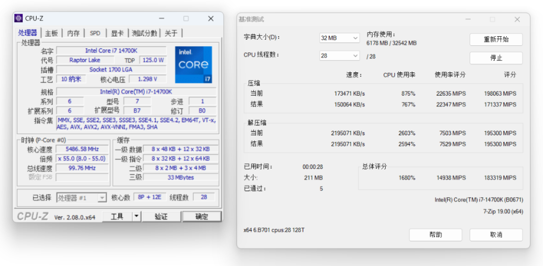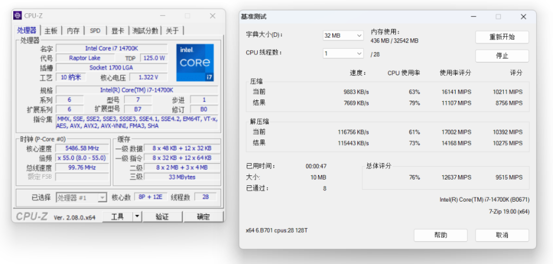 7-ZIP解压缩测试,自动睿频状态下,CPU单线程得分9515MIPS,多线程得分183319MIPS;