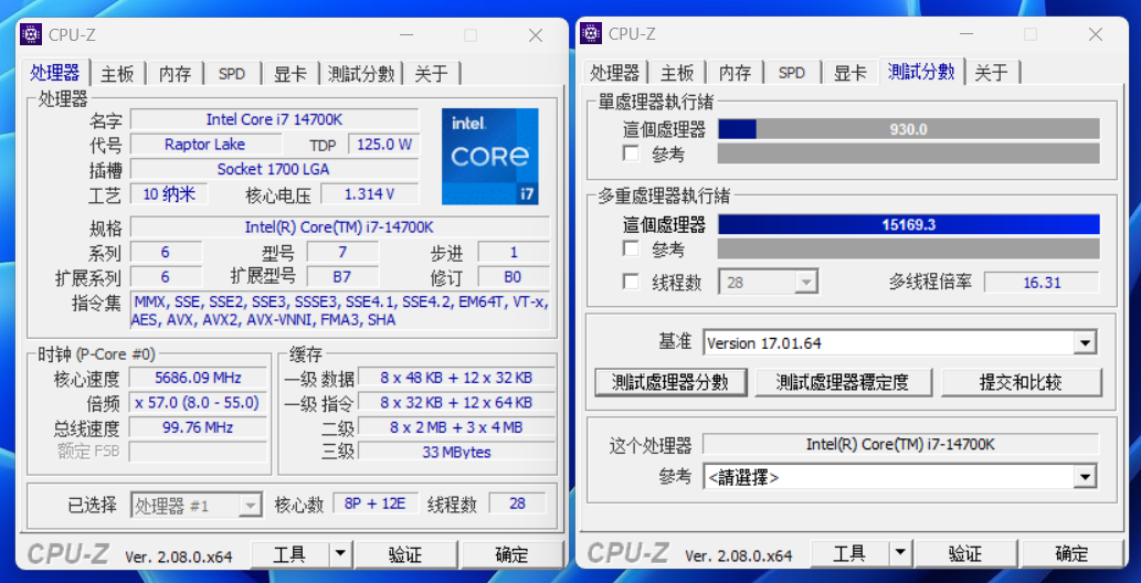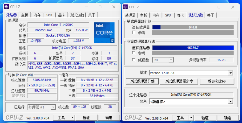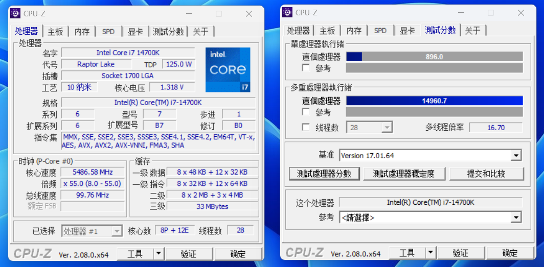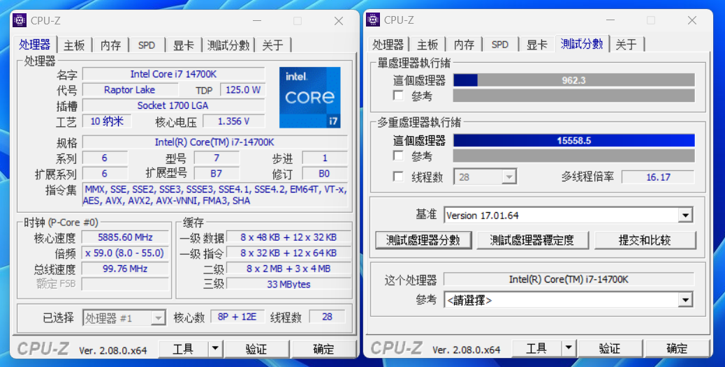 CPU-Z 2.08基准测试:自动睿频状态,14700K单核得分896分,多核得分14960.7分。OC全核5.7GHz后,再次测试,单核得分930分,多核得分15169.3分。继续OC至全核5.8GHz后,单核得分944.8分,多核得分15379.7分;OC至全核5.9GHz,单核得分962.3分,多核得分15558.5分;