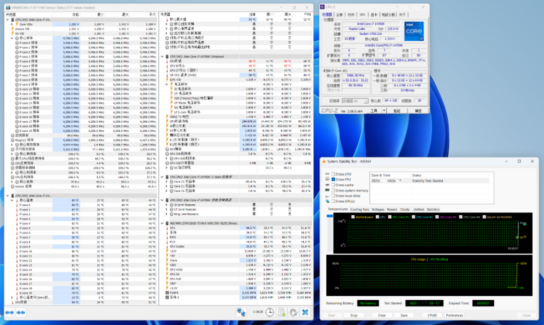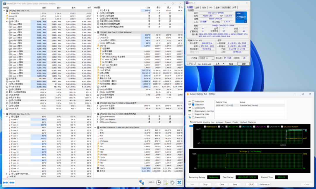 OC至全核5.7GHz,继续烤机,CPU功耗稳定在300W+,CPU温度101°;更高频率,暂未过测。但新一代酷睿处理器对散热的高需求,应该是显而易见的。