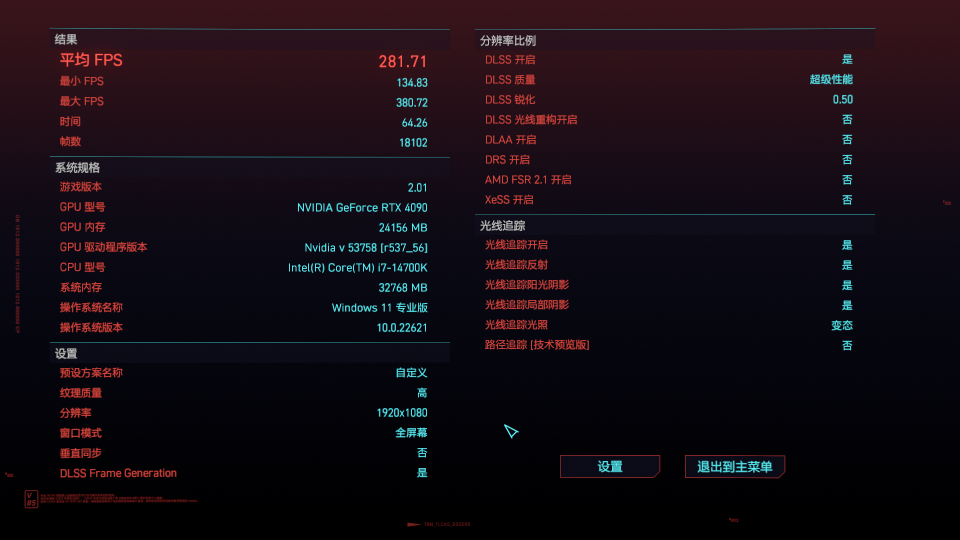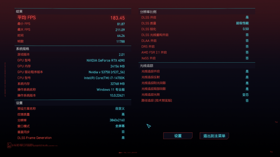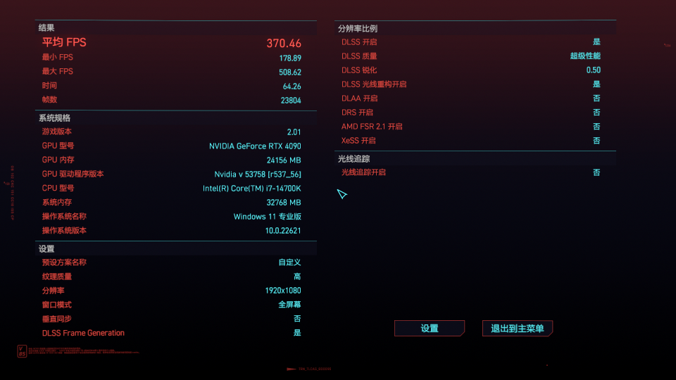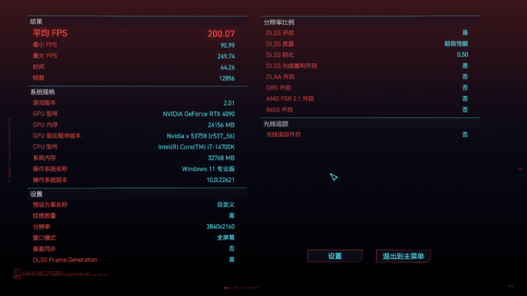 《赛博朋克2077》基准测试,画质超级,DLSS设为超级性能模式,并开启DLSS 3.0,4K分辨率下,游戏平均帧率为200.07 FPS。2K分辨率下,游戏平均帧率为314.32FPS。1080P分辨率下,游戏平均帧率为370.46FPS;