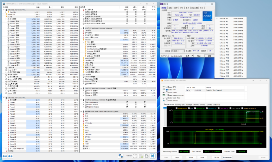 手动将CPU电压设为1.28v,并解锁温度限制后,再次烤机,CPU功耗稳定在280W左右,CPU温度为97°左右;