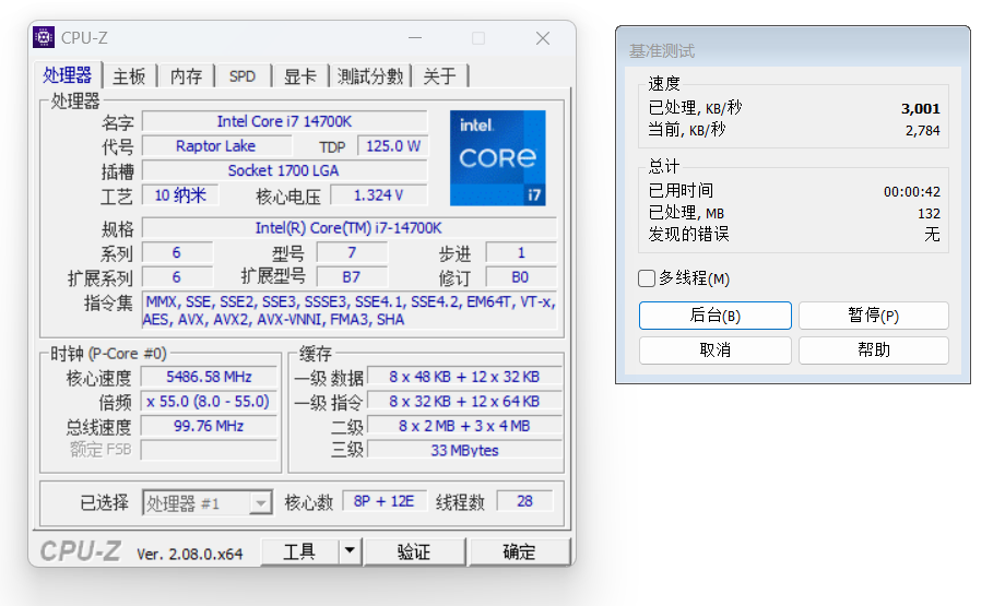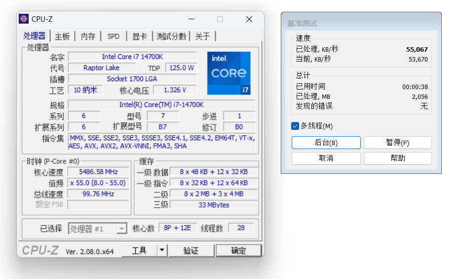 英特尔 i7-14700K处理器,延续上代处理器的LGA 1700封装规格,上代8P+8E变成了8P+12E 20核心28线程,二级缓存从24MB增加到28MB,三级缓存从30MB增加到33MB。P核最高频率从5.4GHz提高到5.6GHz,E核则从4.2GHz提高到4.3GHz,基础功耗为125W,最大睿频功耗为253W;