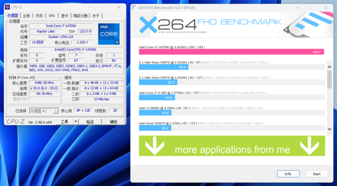 x264 FHD Benchmark编解码测试,自动睿频状态下,14700K测试得分为133.7 FPS;