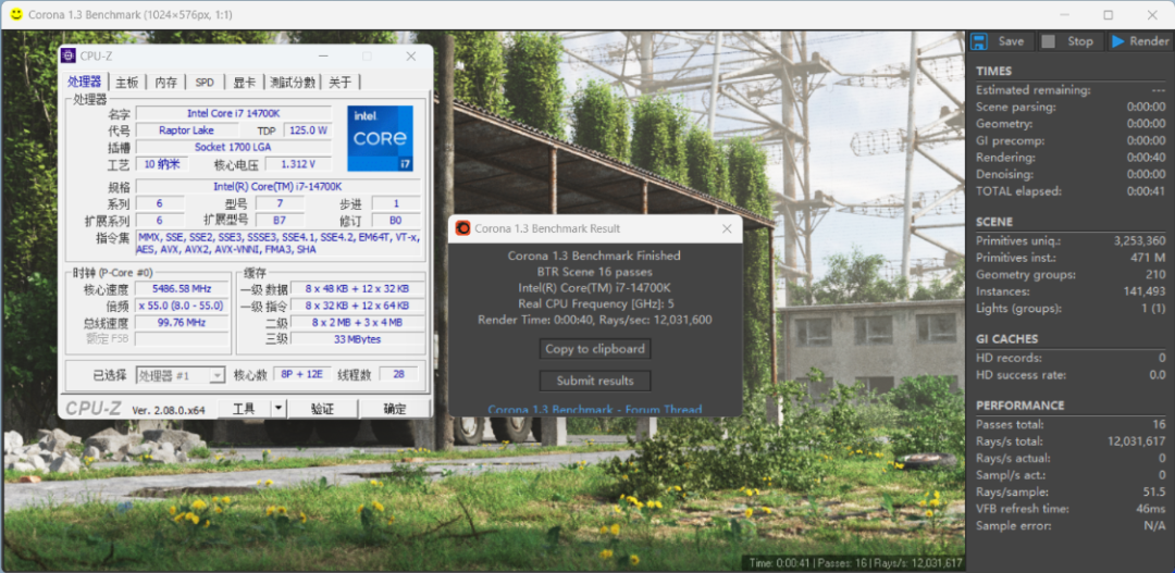 Corona 1.3 Benchmark渲染测试得分,自动睿频状态下,14700K测试渲染耗时40秒,渲染速度为12031600 Rays/s。
