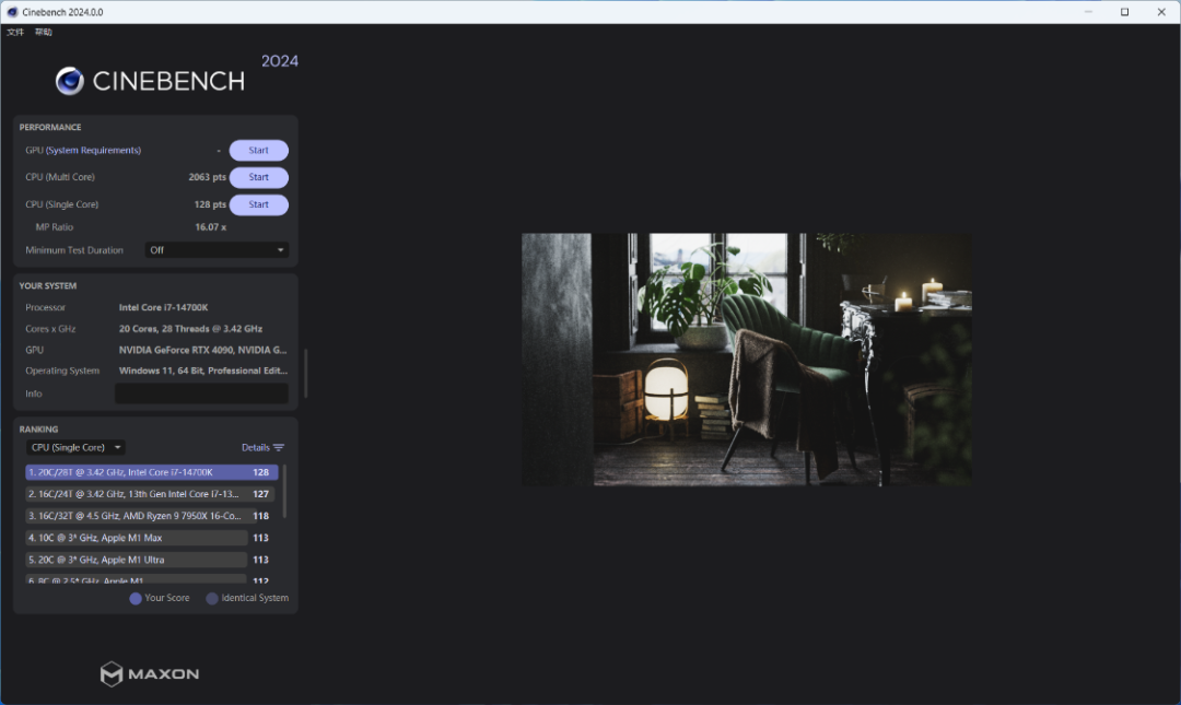 CineBench 2024测试,自动睿频状态下,14700K单核得分128pts,多核得分2063pts;