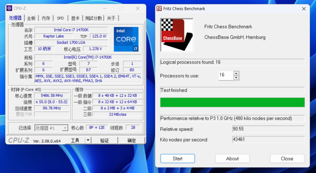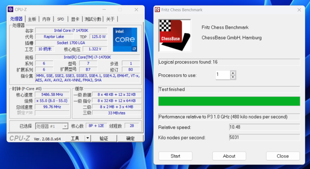 Fritz Chess Benchmark(弗里兹国际象棋基准测试),自动睿频状态下,CPU单线程得分5031分,多线程得分43461分;