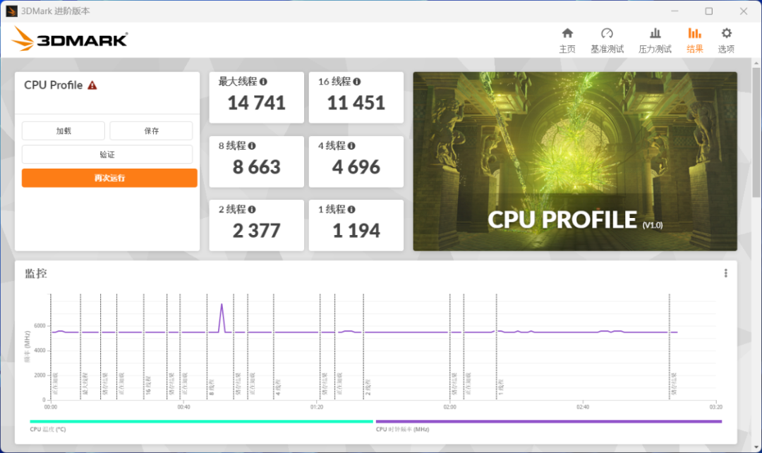 CPU Profile测试,自动睿频状态下,CPU单线程得分1194分,最大线程得分14741分;