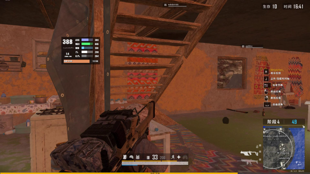 《PUBG 绝地求生》游戏中,三极致画质,渲染比例100%,图形API为DirectX 11,1080P分辨率下,游戏实际帧率为380FPS左右,1分钟内平均帧率为366FPS;