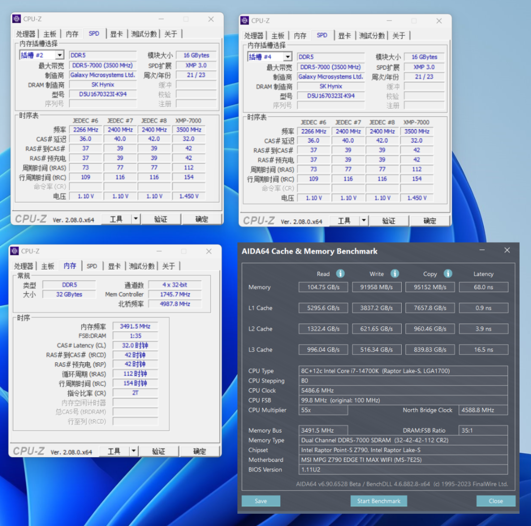 内存读写测试,直接开启XMP,内存读取速度为104.75 GB/s,写入速度为91958 MB/s,复制速度为95152 MB/s,延时为68 ns;