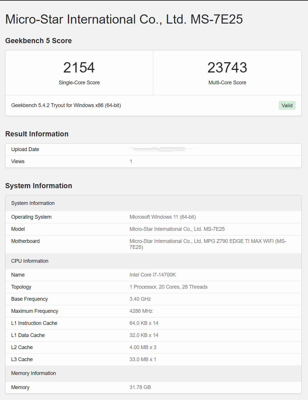 GeekBench 5基准测试,自动睿频状态下,14700K单核得分2154分,多核得分23743分;