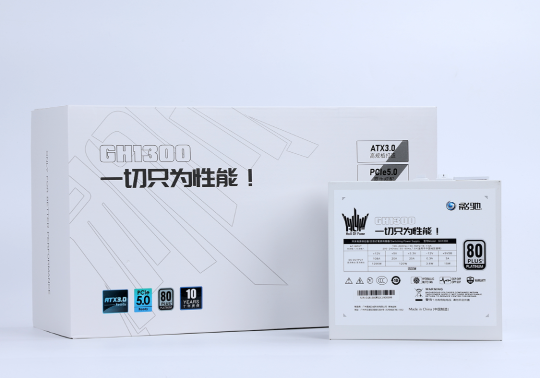 电源方面,选择的是支持PCIE 5.0和ATX3.0的影驰HOF GH1300白金牌全模组电源。全日系电容豪华配置,内置一颗12CM纯白静音风扇,并支持支持智能启停功能。提供2个原生支持PCIE 5.0标准的12VHPWR显卡供电接口,单线最高可以提供600W的供电能力,可以完美满足顶级RTX40系显卡的双12VHPWR接口供电需求。