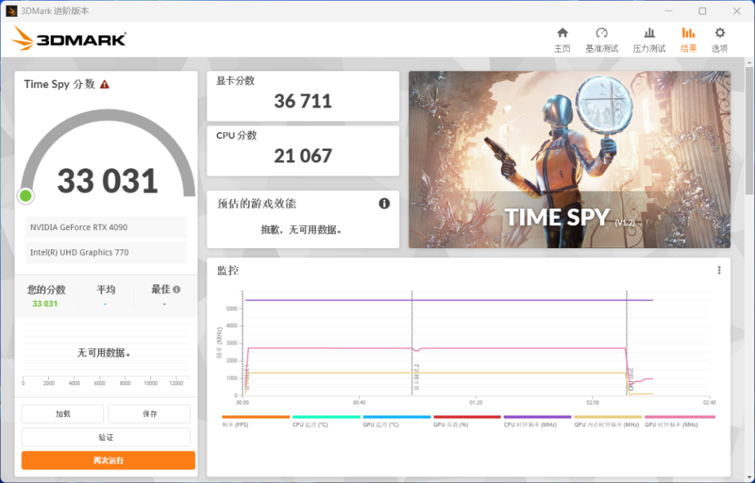Time Spy基准测试,自动睿频状态下,CPU得分21067分;