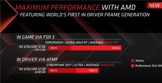 现在,AMD更是有了新一代超分技术FSR 3、帧生成技术、AFMF平滑移动帧技术,更是第一次在驱动层面实现了帧生成,而不像NVIDIA RTX 40系列那样必须依赖特定硬件。