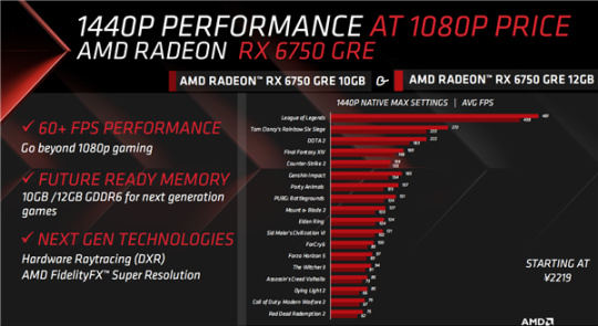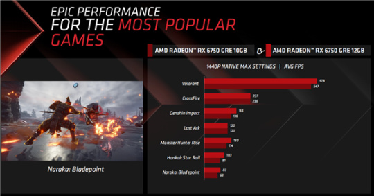 性能方面,AMD保证,RX 6750 GRE系列可以在2K分辨率、原生最高画质下,为3A游戏带来60+FPS的流畅表现,10/12GB大显存更是可以满足未来游戏需求。