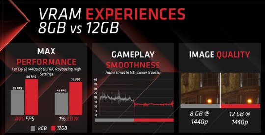 RX 6750 GRE 12GB就可以轻松满足这一需求,在《孤岛惊魂6》游戏中,对比8GB显存可带来45%左右的平均帧率提升、接近50%的1%最低帧率提升,使得游戏更加流畅,还可以获得更高画质。