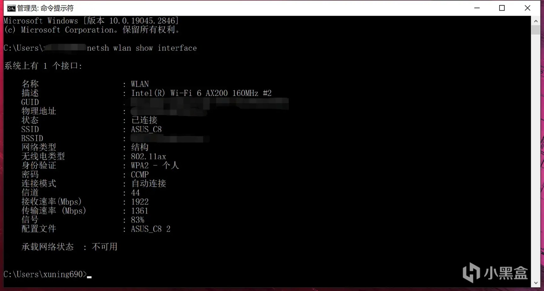 与之类似,在Windows电脑的命令提示符中,使用netsh wlan show interface指令也可以获取握手速率信息,能让我们有一个相对直观的判断。