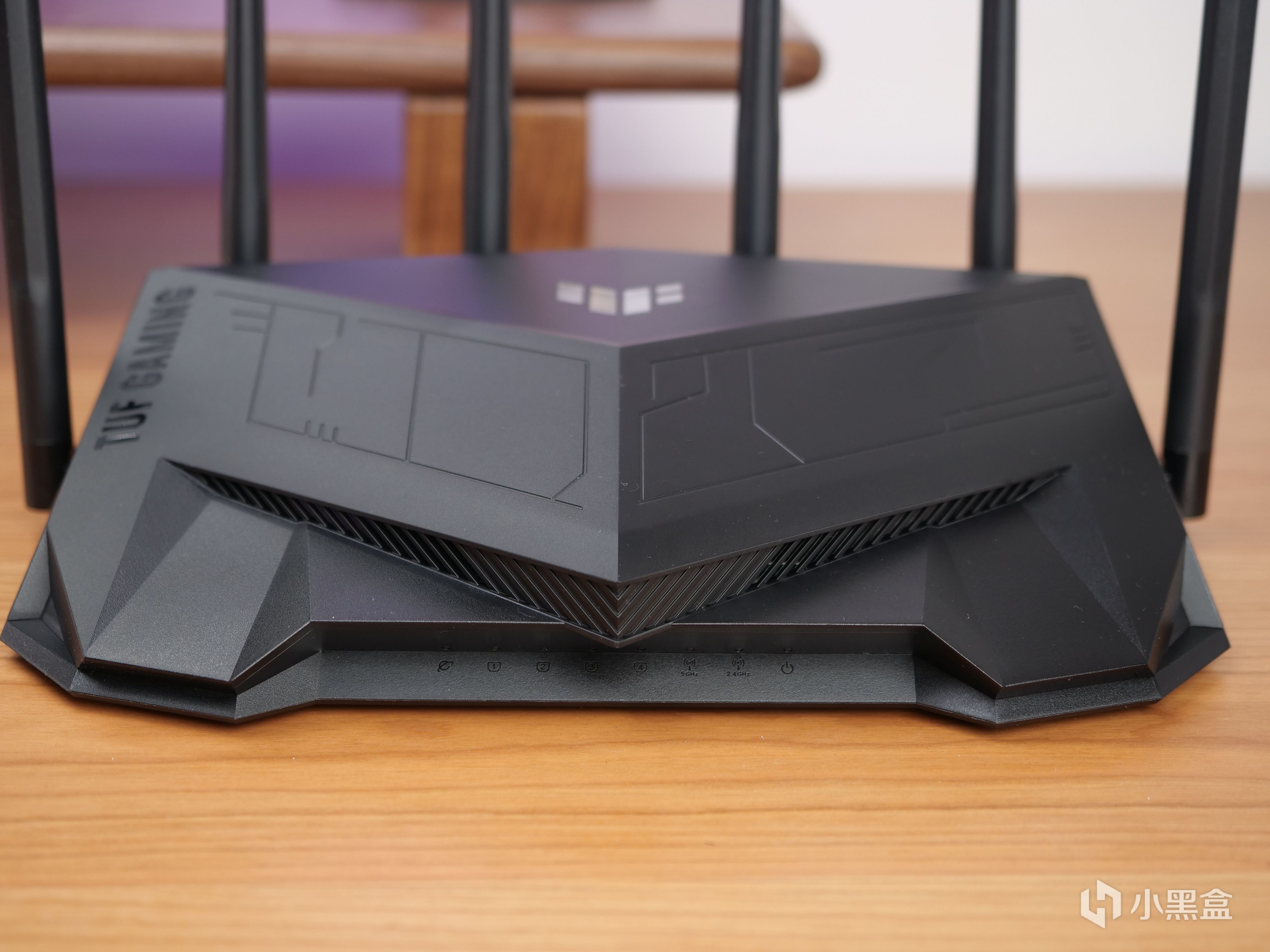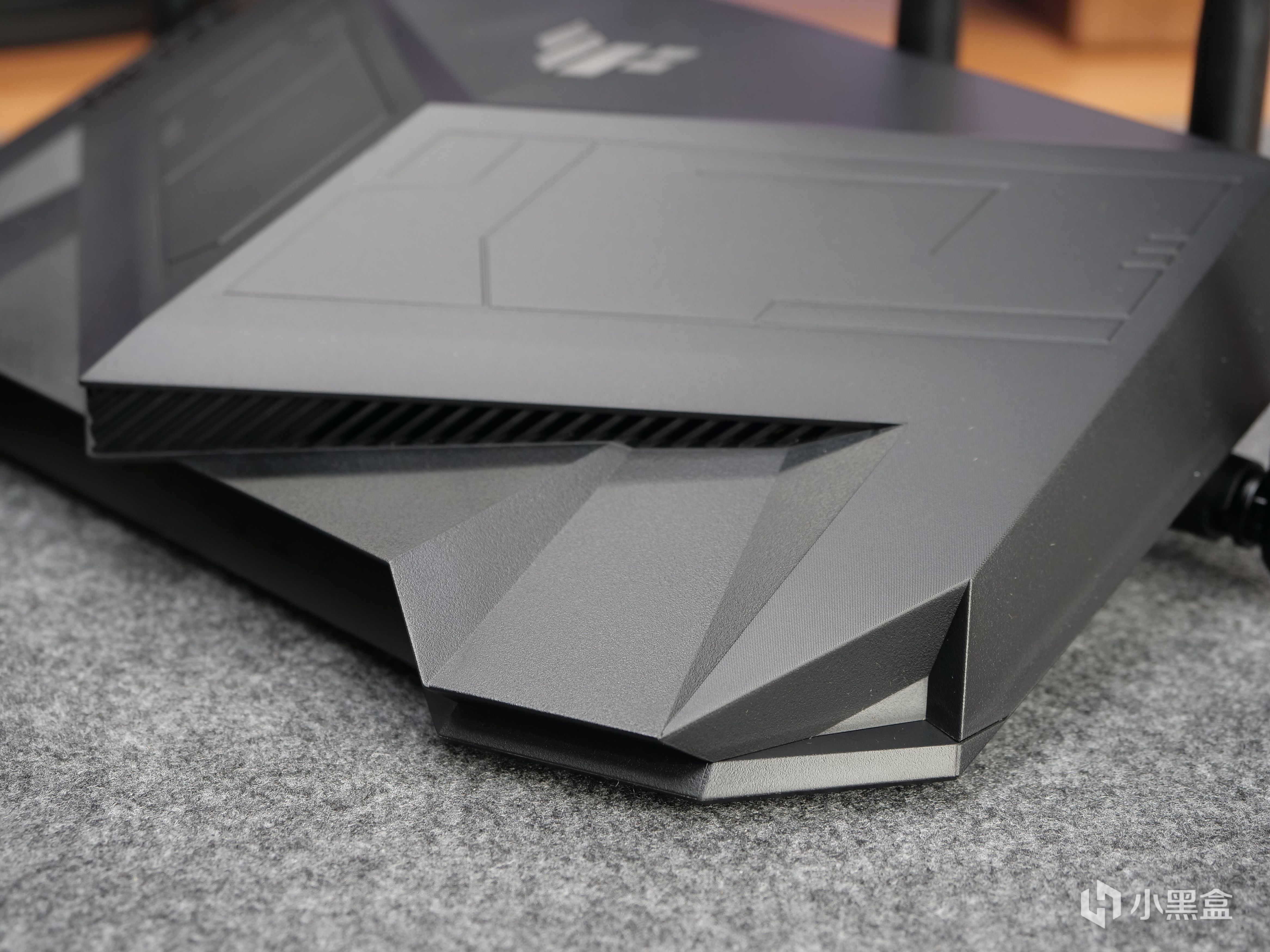 外观方面,华硕TUF AX5400棱角分明,倾斜设计使得整台路由器颇有种类似跑车的速度感,视觉观感锋芒毕现。