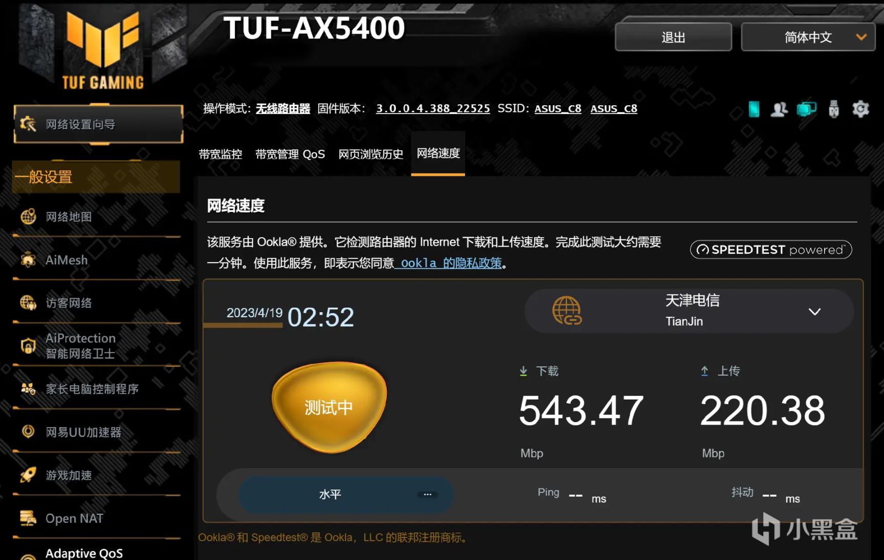 例如在华硕路由器的固件中,就内置了网络测速功能。简单测试一下我家的宽带,速度还是很正常的。
