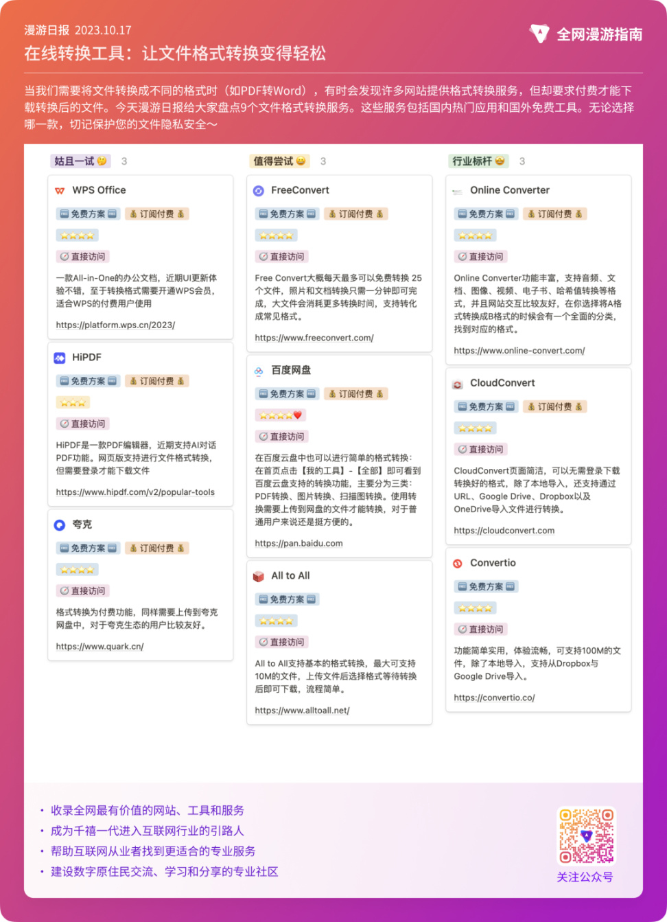 當我們需要將文件轉換成不同的格式時(如PDF轉Word),有時會發現許多網站提供格式轉換服務,但卻要求付費才能下載轉換後的文件。今天漫遊日報給大家盤點9個文件格式轉換服務,每一款都實際體驗過。這些服務包括國內熱門應用和國外免費網站。無論選擇哪一款,切記保護您的文件隱私安全~