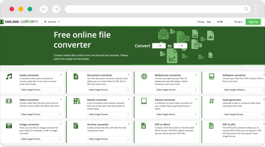 Online Converter功能豐富,支持音頻、文檔、圖像、視頻、電子書、哈希值轉換,並且網站交互比較友好,在你選擇將A格式轉換成B格式的時候會有一個全面的分類,找到對應的格式。