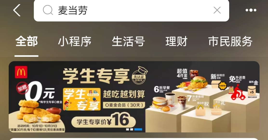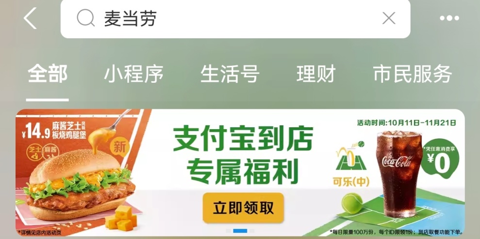 支付寶這邊就是直接搜索麥當勞,他一般會有免費麥樂雞和可樂 薯條的活動