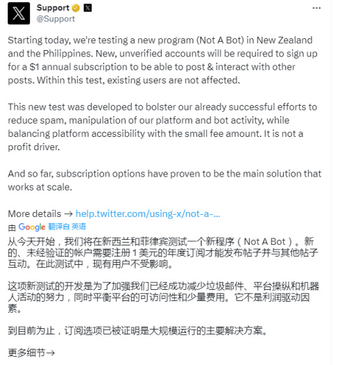而就在今天,推特官方發佈公告宣佈:其將在新西蘭和菲律賓測試一個名爲“Not A Bot”的·新程序,在該程序下,新註冊的推特用戶和未經過驗證的賬戶將需要支付1美元(約7.3人民幣)購買年度訂閱,才能解鎖發佈帖子並參與推特上其他帖子的互動的內容。除了上述賬號或用戶外,本次測試的新程序現有用戶(老用戶)並不受影響