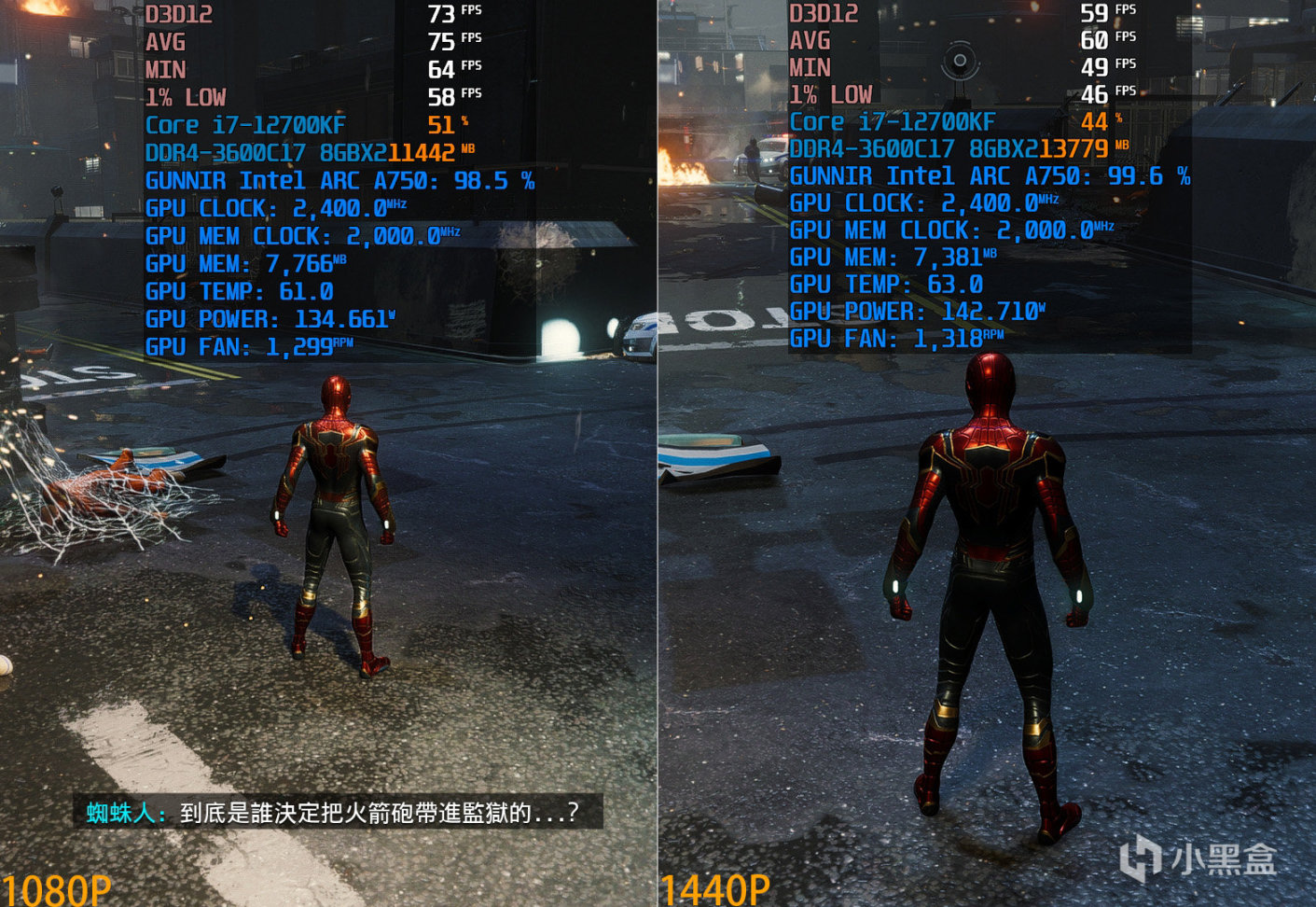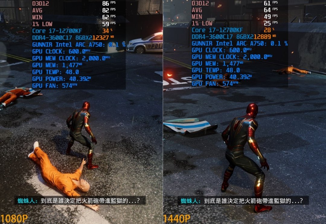 XeSS超級採樣測試選擇《古墓麗影:暗影》和《漫威蜘蛛俠》這兩款遊戲, 目前具有性能、平衡、品質和超級品質四種模式,這裏直接統一搭配最好的超級品質模式,並且開啓遊戲內的光追,在1080P和2K分辨率下測試,可以看到運行幀率都超過60fps,開啓光追+XeSS的情況,基本等於原來不開光追和XeSS的幀率,也就是說有光追畫質提升下,卻不怎麼損失性能,這其實就是爲什麼各家需要大力發展這種提升技術的原因。