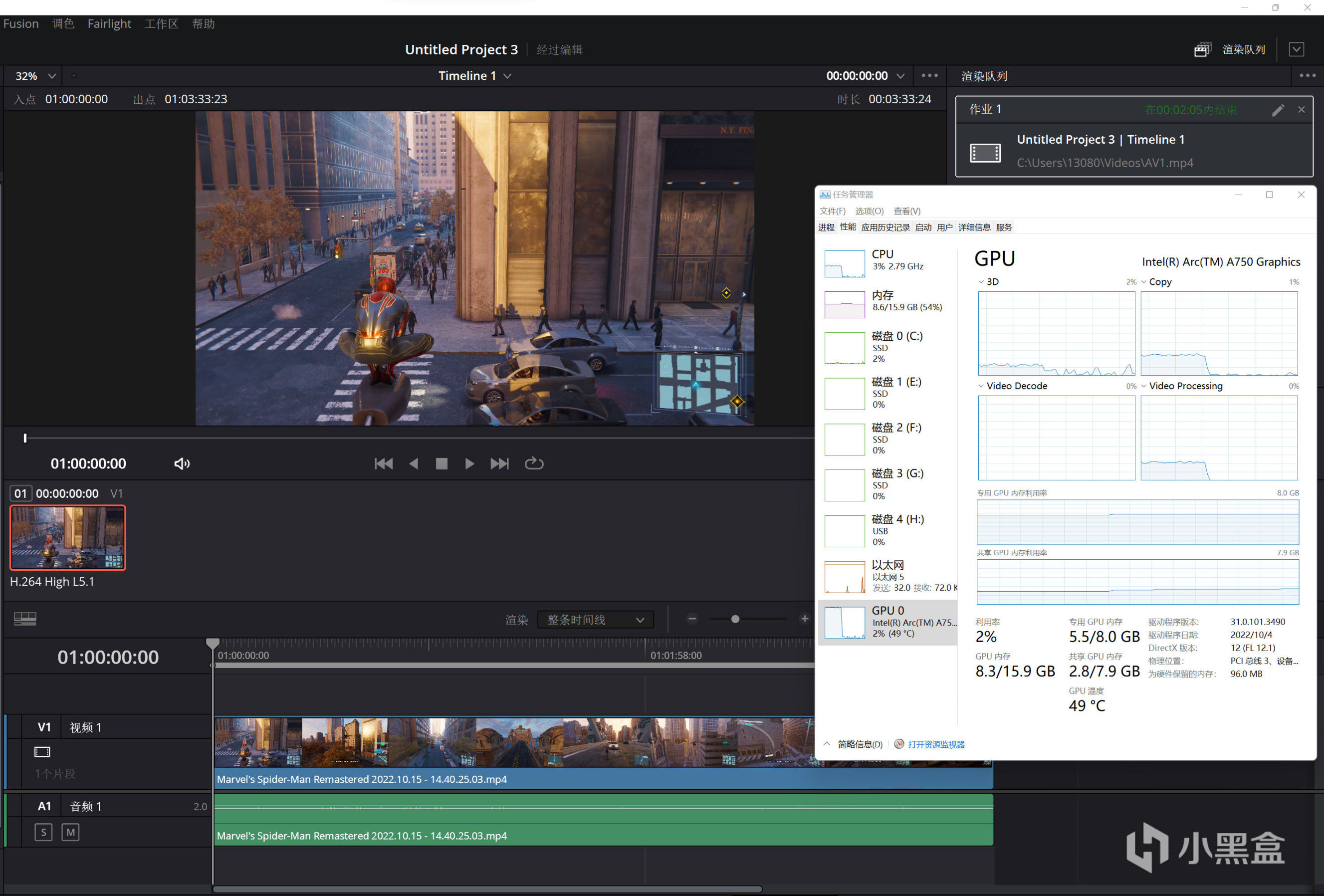 比如使用DaVinci Resolve進行轉碼,Arc A750使用AV1編碼比上一代旗艦N卡還要快,別看這僅相差幾十秒,到了真正更復雜的剪輯流程中差距會進一步擴大,除了效率以外,在視頻壓縮體積上也有明顯優勢,另外一個很明顯的例子,對於特別對於喜歡經常錄製遊戲視頻的玩家,AV1編碼能幫你節省一些硬盤存儲空間。