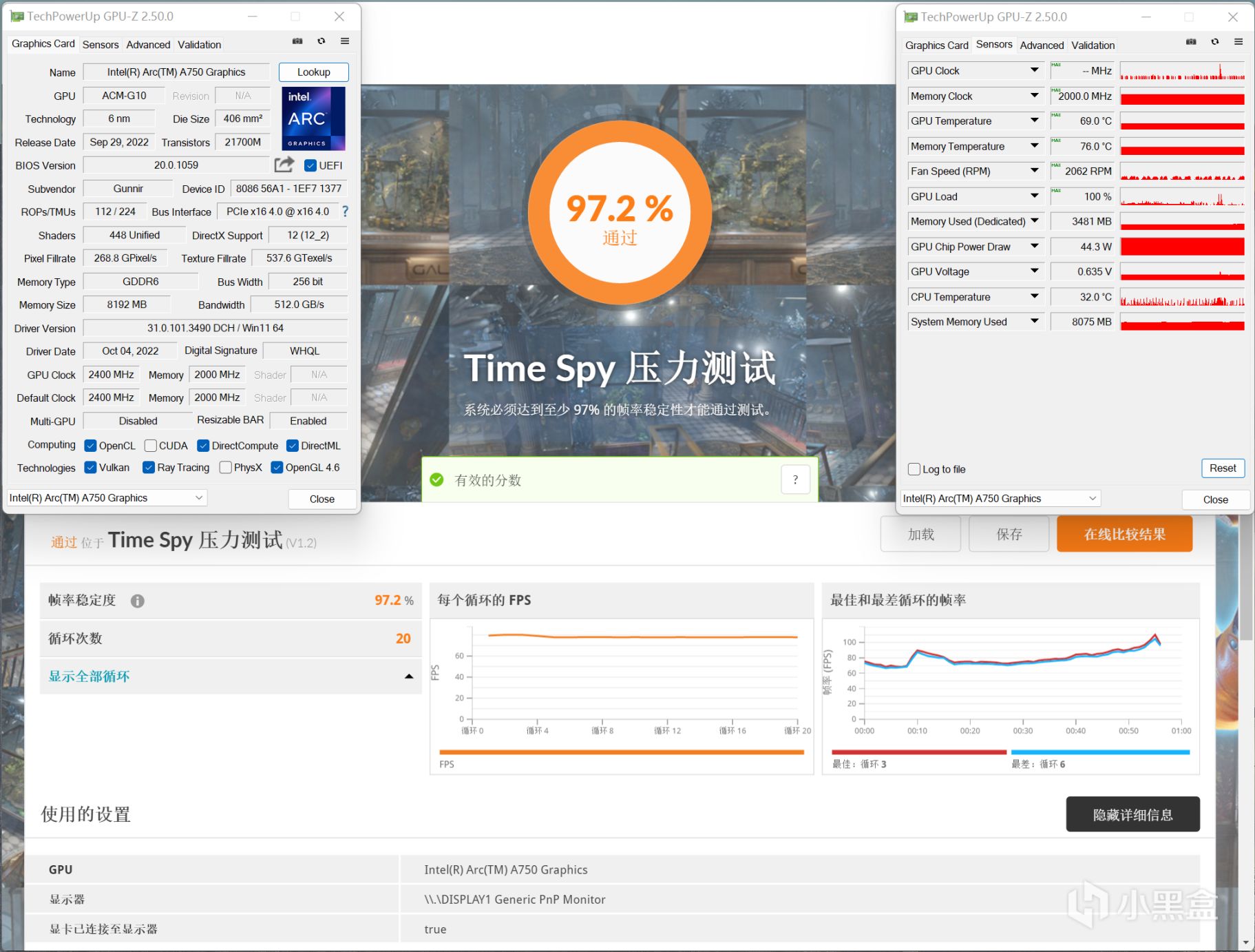 最終GUNNIR Arc A750 FLUX是以97%的穩定度通過烤機,封箱情況下,最高核心溫度爲69℃,顯存溫度爲76℃,散熱表現還不錯,風扇轉速也控制在2000RPM左右,機箱隔絕之後噪聲感知很小,另外值得關注的是顯卡功耗,在3DMARK Time Spy壓力項目最高也就200W左右,實際在以上十款遊戲中顯示功耗會更低,也就是顯卡工作負荷會低一些的。
