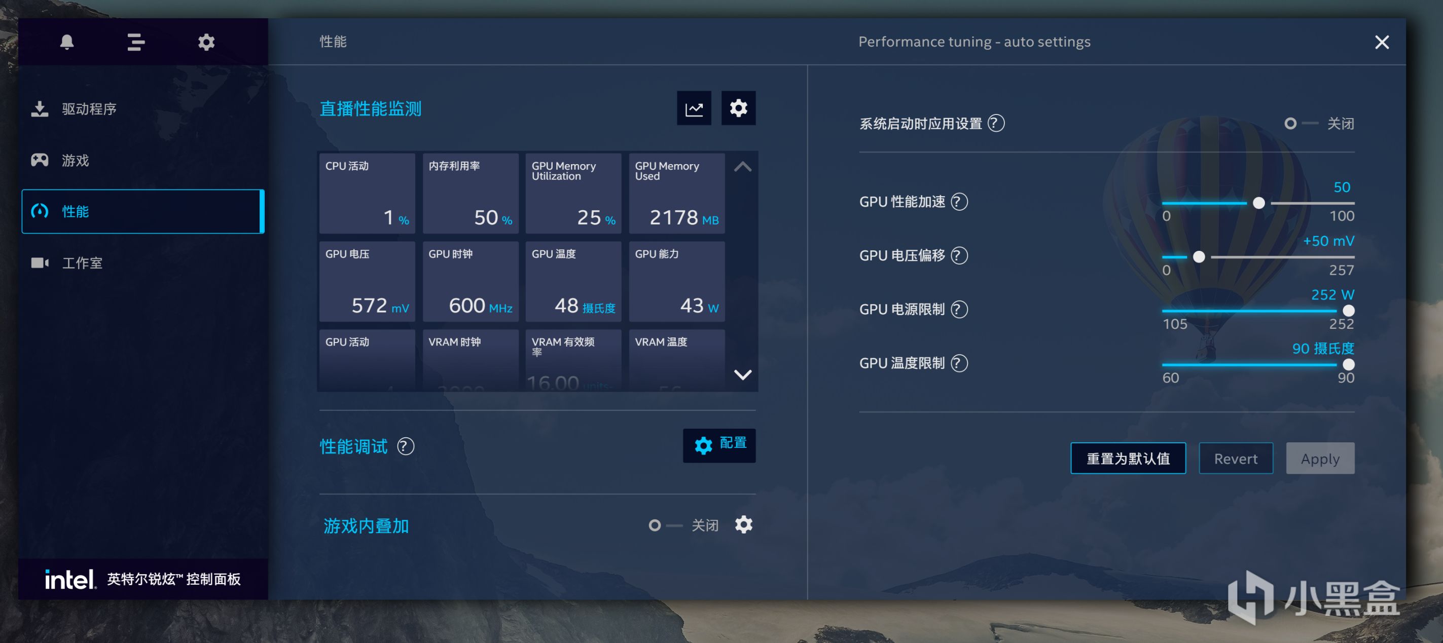 Arc Control自帶顯卡性能監測和超頻功能,目前Arc系列顯卡對於常規OSD(HWiNFO64使用起來會比較繁瑣)和超頻軟件支持還不完善,這個功能正好就彌補了這方面。這裏通過Arc Control簡單對GUNNIR Arc A750 FLUX進行一個小超頻,調試幅度如上圖所示,值得注意的是,電壓偏移值過高會撞功耗牆(即便拉到最大252W),過低會影響超頻穩定性,需要耐心調試。