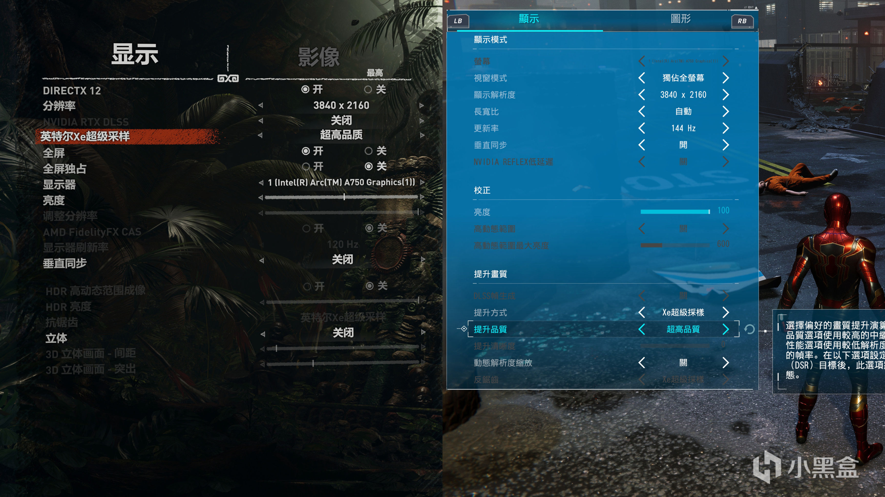 《漫威蜘蛛俠》預設非常高畫質DX12+最高光追反射+XeSS超級品質