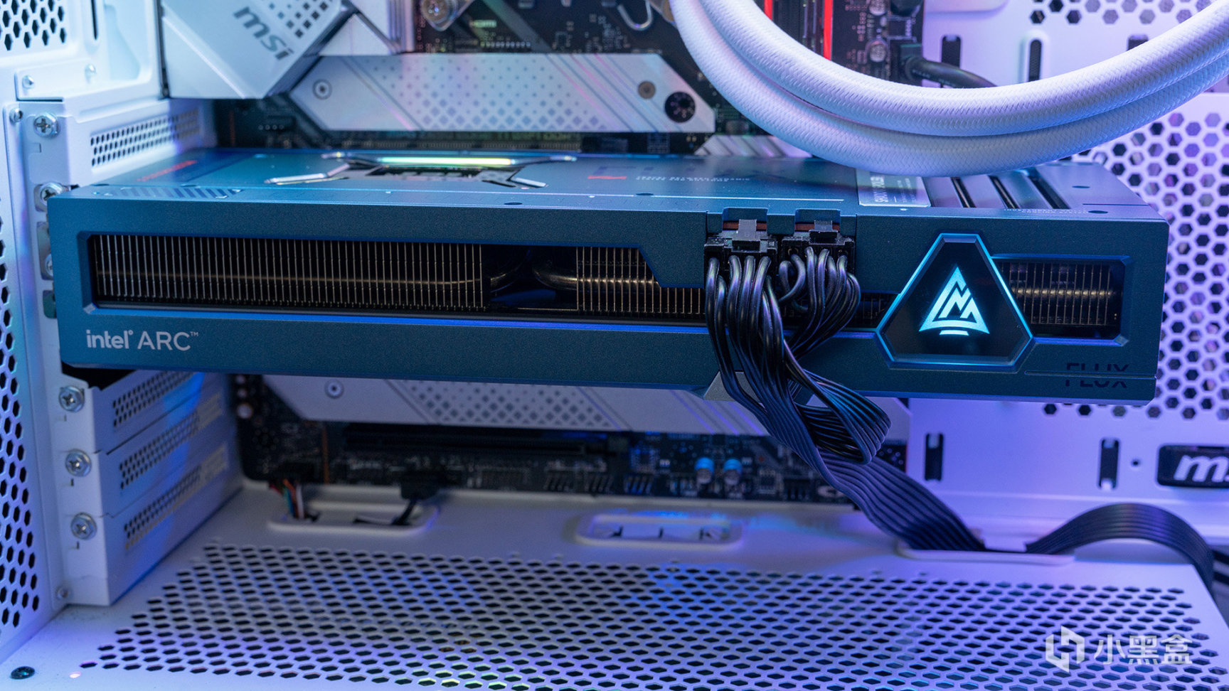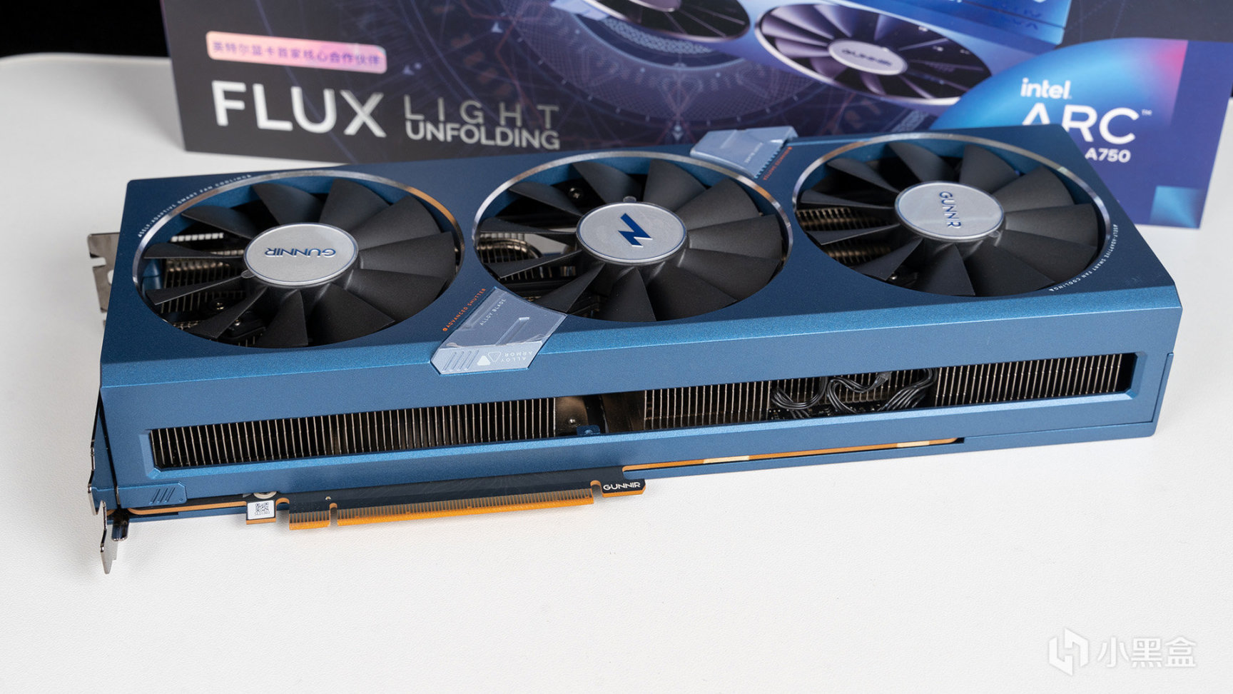顯卡本體,個人評價只能說是好看兩字,GUNNIR Arc A750 FLUX通體採用蒼藍配色(還有一種是影灰),看起來就是英特爾純統血脈,這種色調在以外大多的黑白配色中,顯得格外分明和新鮮,它也沒有很複雜的線條,略帶點機械感的色塊是畫龍點睛之處,是非公版顯卡的一股清流。