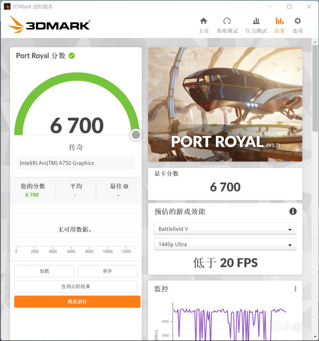 GUNNIR Arc A750 FLUX 3DMARK Port Royal顯卡分數爲6700